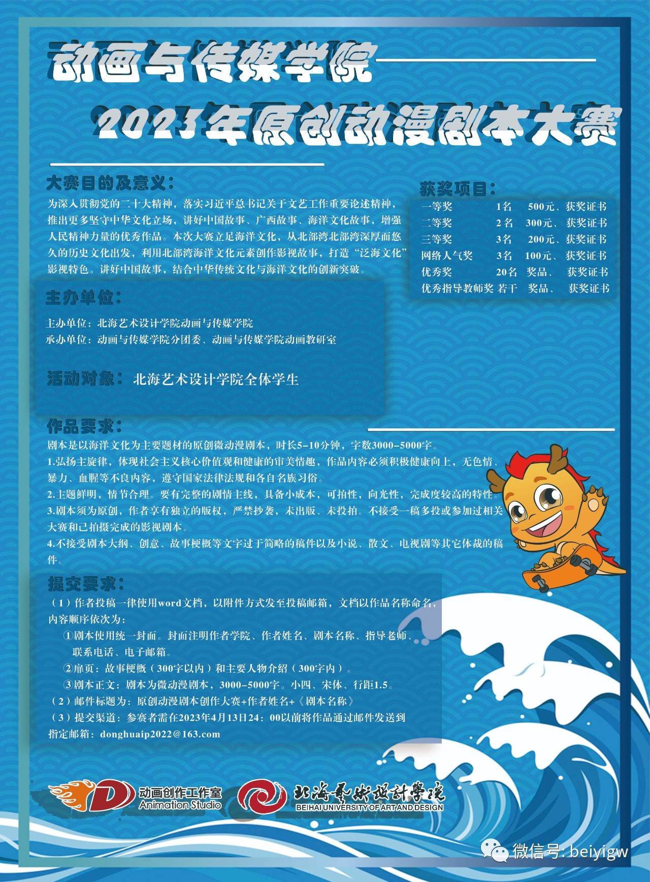 为深入贯彻党的二十大精神,落实习近平总书记关于文艺工作重要论述精神,推出更多坚守中华文化立场,讲好中国故事、广西故事、海洋文化故事,增强人民精神力量的优秀作品。同时,通过“以赛促教,以赛促学、以赛促改、以赛促建”的模式,训练学生创新、创意的思维能力,推动艺术教学教育的改革与发展,激发广大学生对艺术创作的热爱。现决定举办2023年原创动漫剧本大赛。
