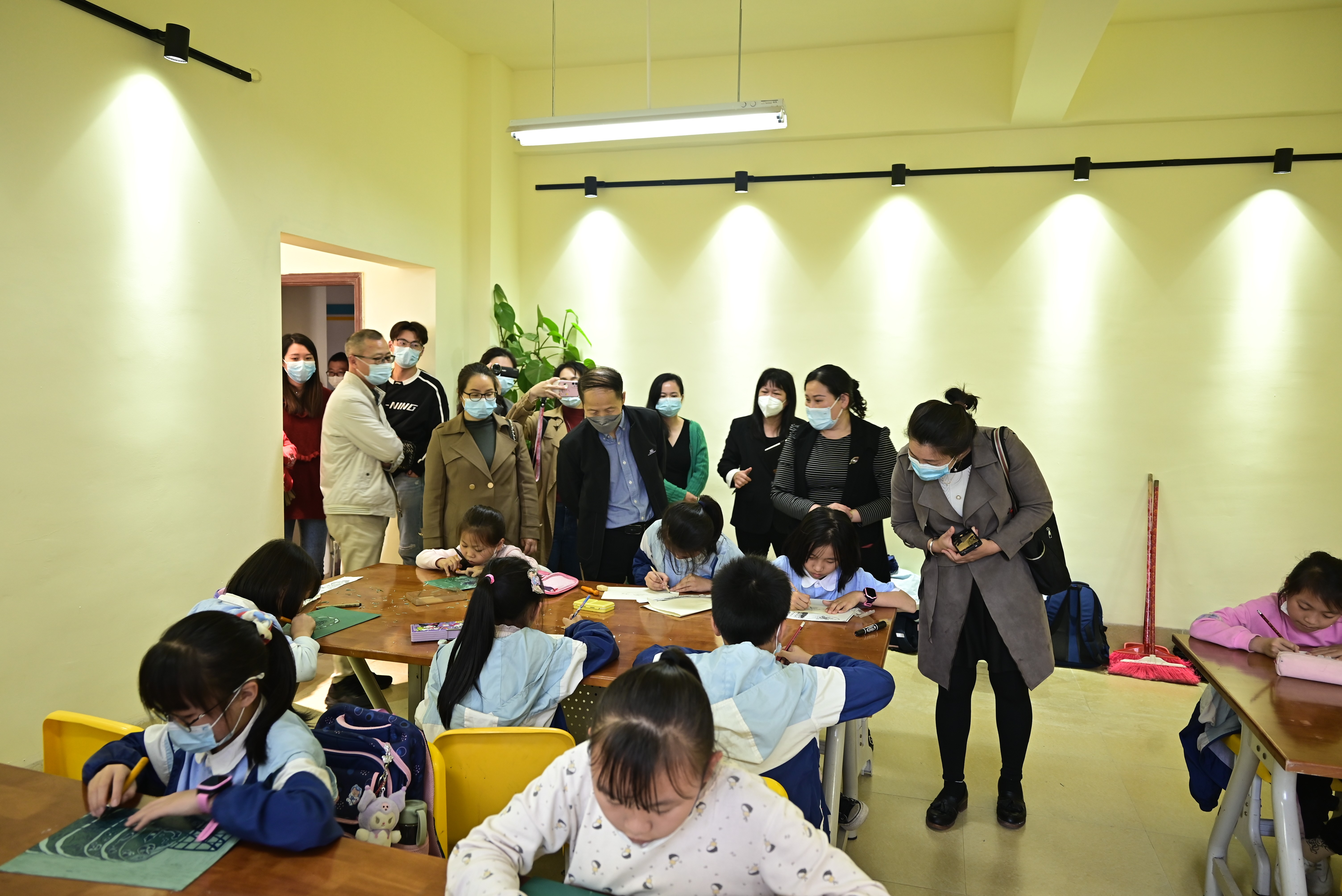 会后,包校长带领郭教授及考察团队一行人进入合唱、舞蹈、非遗贝雕传习、版画与书法的课堂进行实时走访考察走访中包校长带领大家到艺术教育专业的毕业实习生的  美术课堂,并向考察组详细介绍了实习生的工作安排管理,对实习生的工作能力给予了充分肯定。