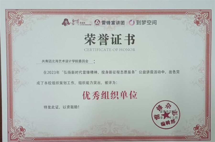 近日,共青团北海艺术设计学院委员会在雷锋杂志社、到梦空间主办的2023年“弘扬新时代雷锋精神,投身新征程志愿服务”公益讲座活动中,出色完成了组织策划工作,组织能力突出,荣获优秀组织单位。