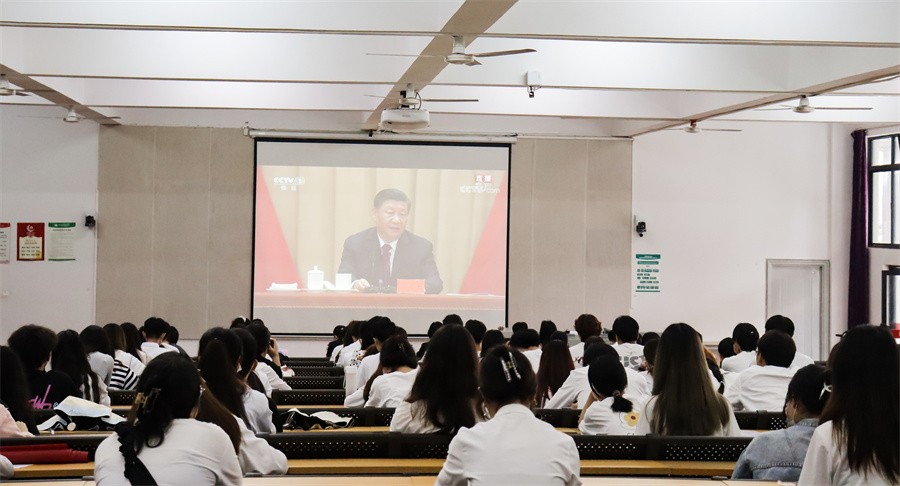 5月10日上午,庆祝中国共产主义青年团成立100周年大会在北京人民大会堂隆重举行。中共中央总书记、国家主席、中央军委主席习近平发表重要讲话。我校校党委书记张阳,党委副书记、副校长彭仁,党委副书记韦静月,副校长黄侃明,学校团委及分团委教师、学生团员代表,各基层党组织师生代表共150人于西校区伦理楼107收听收看大会实况。