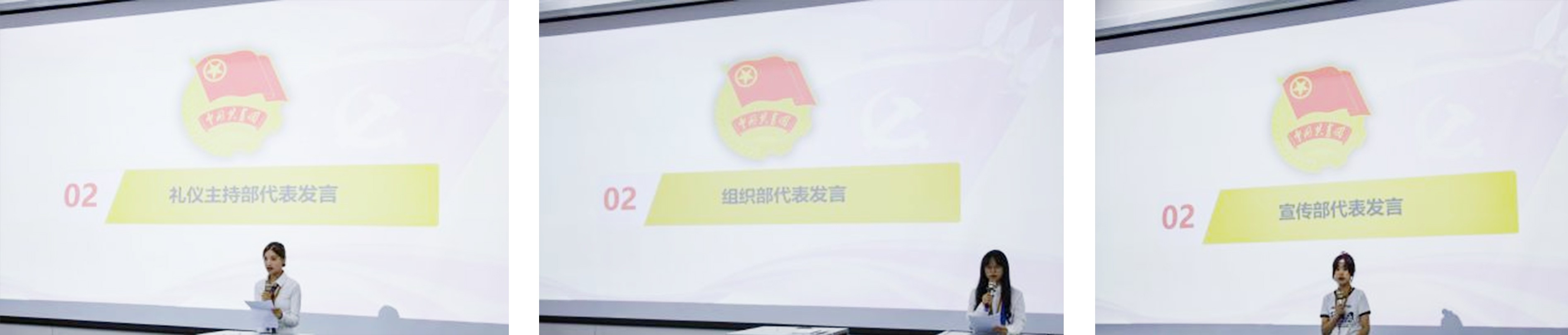 (礼仪主持部代表陈柳燕)                        (组织部代表林珍娴)                       (宣传部代表赵瑜)