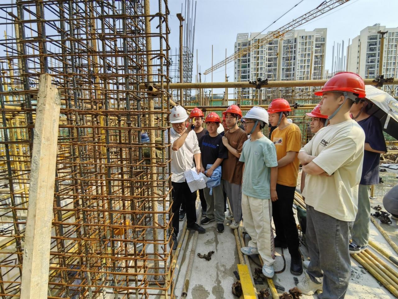 近日,建环学院土木工程专业的学生们走进我校南校区在建宿舍楼项目施工现场,开展了一场别开生面的钢筋施工观摩学习活动。此次活动旨在将课堂理论知识与实际操作相结合,帮助学生们更直观地了解钢筋施工流程和技术要求,提升他们的专业技能和实践能力。