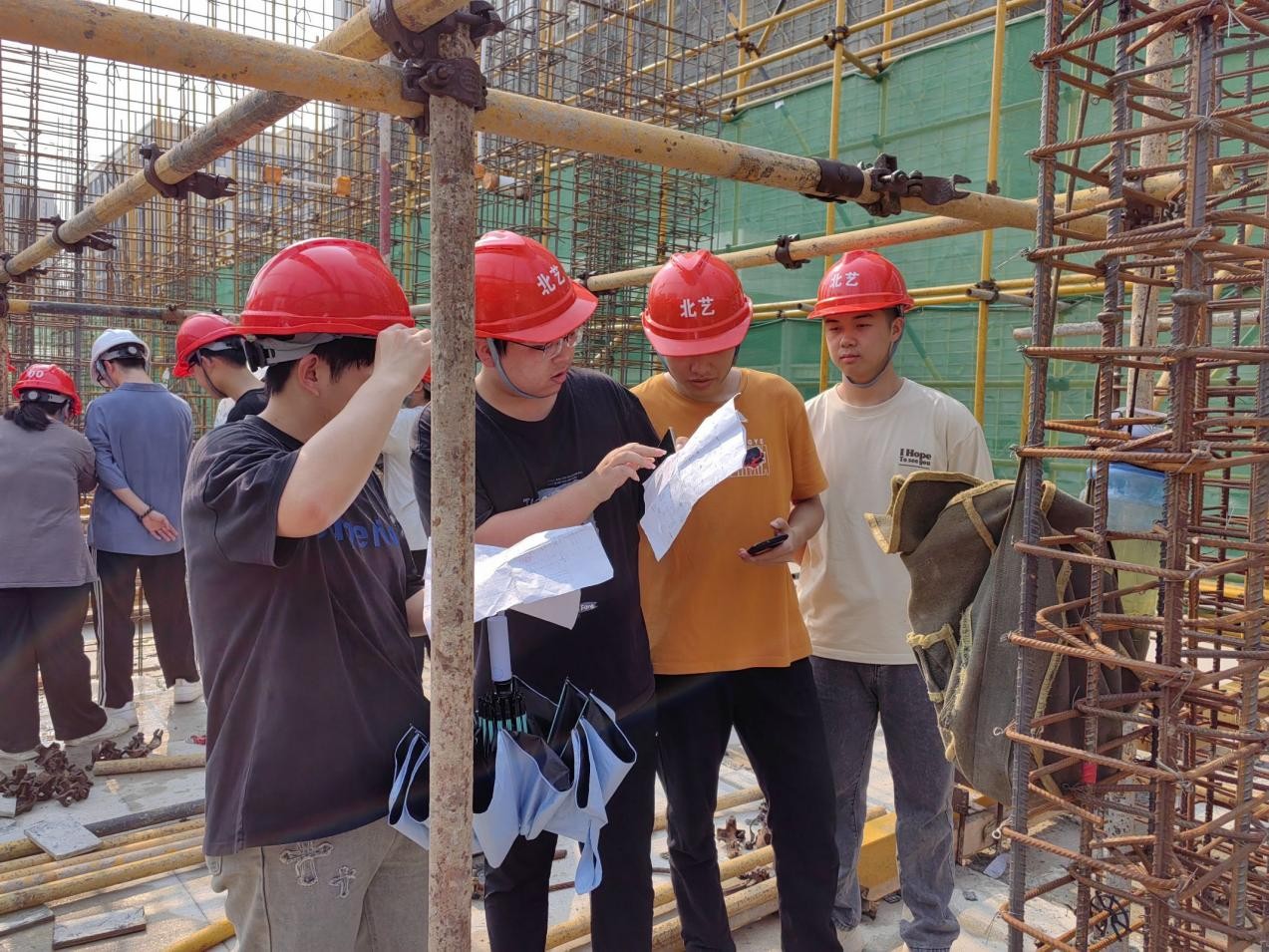 (图二 学生结合施工图纸对照现场施工)