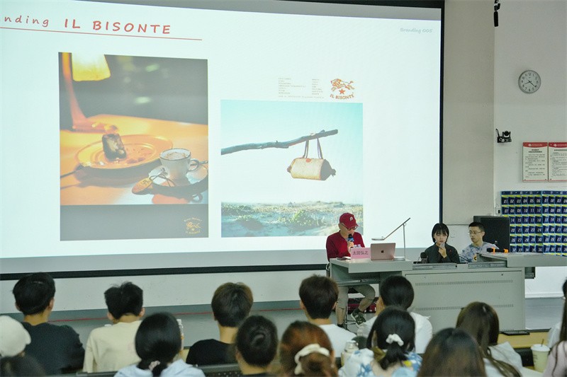 紧接着,太田弘之围绕标志设计与现场师生分享创作经验,在对品牌的标志设计的种种趣味创作经历讲述中,太田弘之指出,做好前期调研工作,是完成优秀设计作品的重要条件,设计需要深思,同时也要简虑,他希望同学们不要过于追求超凡灵感与作品高质量,能够学会调节精神压力,大胆推动作品创作,在松弛轻松氛围中捕捉新颖灵感。同时,他鼓励同学们要积极探索,敢想敢做,保持对新鲜的事物的兴奋感,储备知识,勤做记录,多做积累,为今后的事业发展奠定更好的基础。