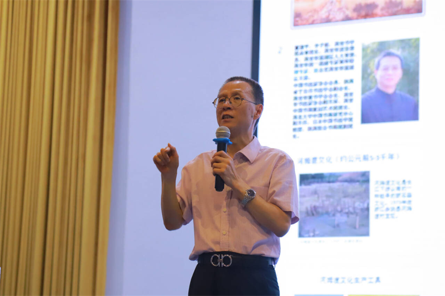 讲座伊始,董建平教授以“文字是传统文化的核心载体”为核心论点切入,从史前文明时期的文化遗存展开论述。他指出,河姆渡文化遗址中出土的陶器刻画符号、仰韶文化的彩陶纹饰,虽属原始表意符号范畴,却真实记录了先民对自然现象的观察、生产生活的实践,是中华文明早期文字形态的重要源头,为商周时期成熟文字体系的形成奠定了基础。