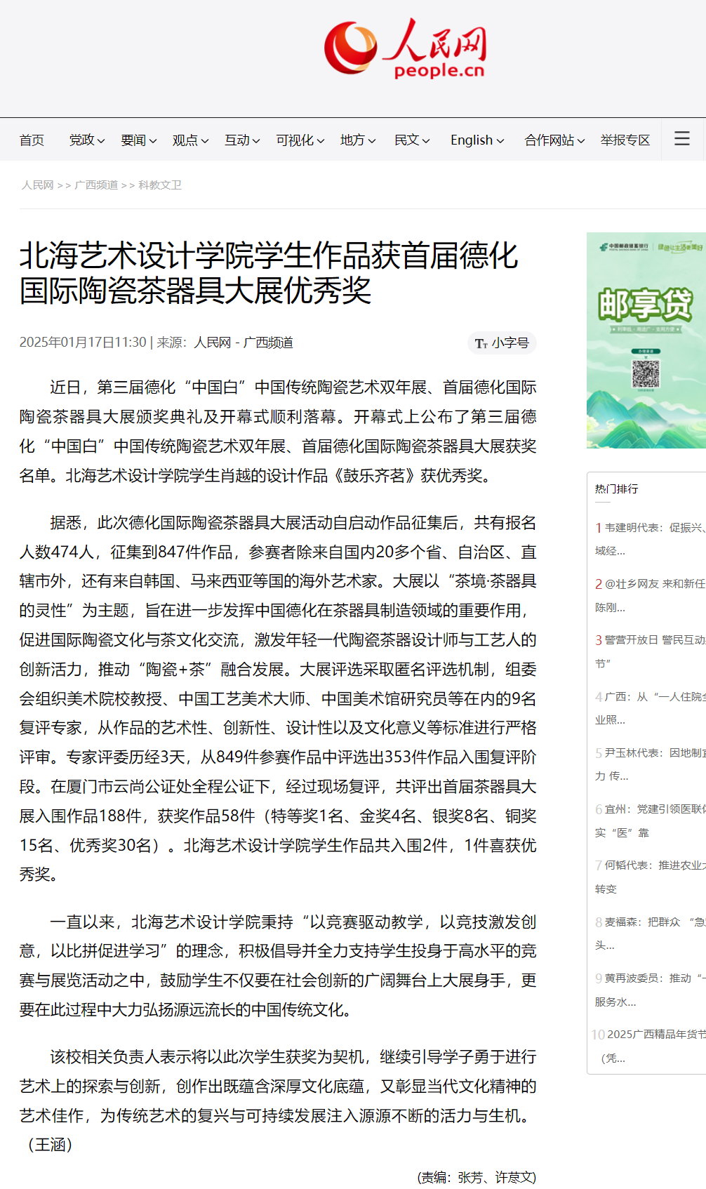 人民网:北海艺术设计学院学生作品获首届德化国际陶瓷茶器具大展优秀奖