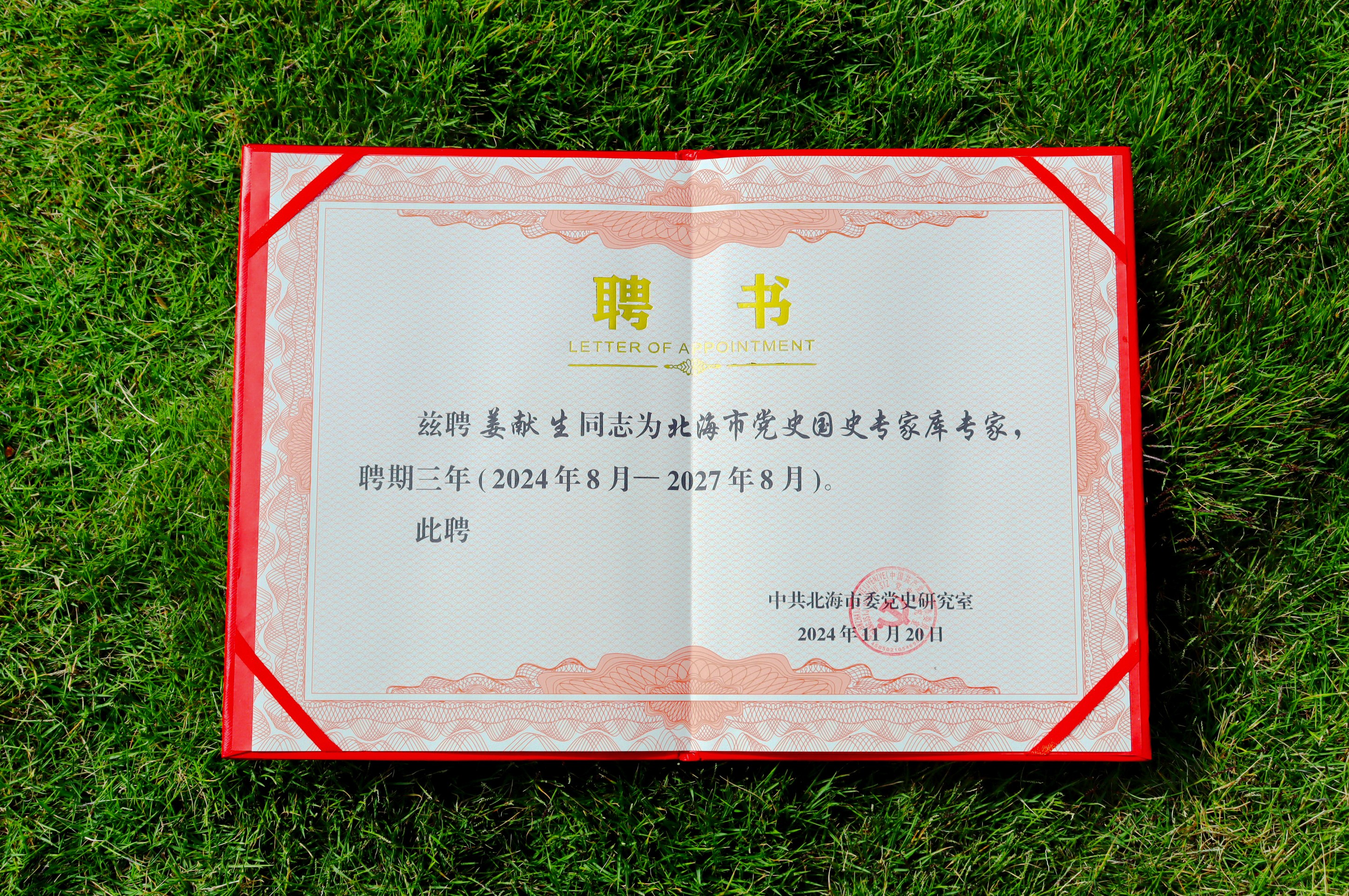 最终,经过严格筛选和研究审定,我院院长姜献生、综合办主任王佳碧凭借其在该专业领域的突出优势,成功入选,被光荣聘为北海市党史国史专家库专家,聘期三年,时间从2024年8月—2027年8月。