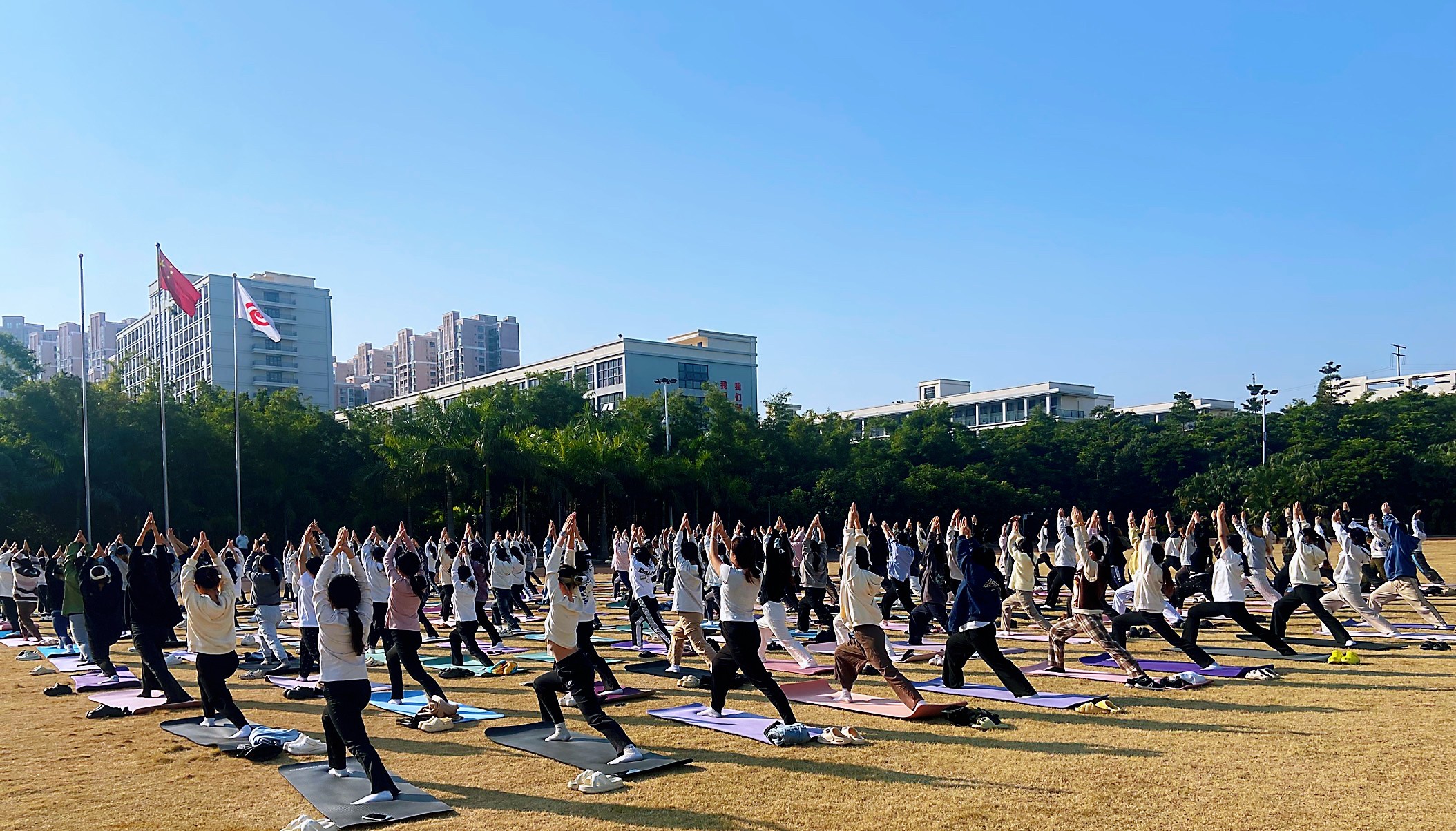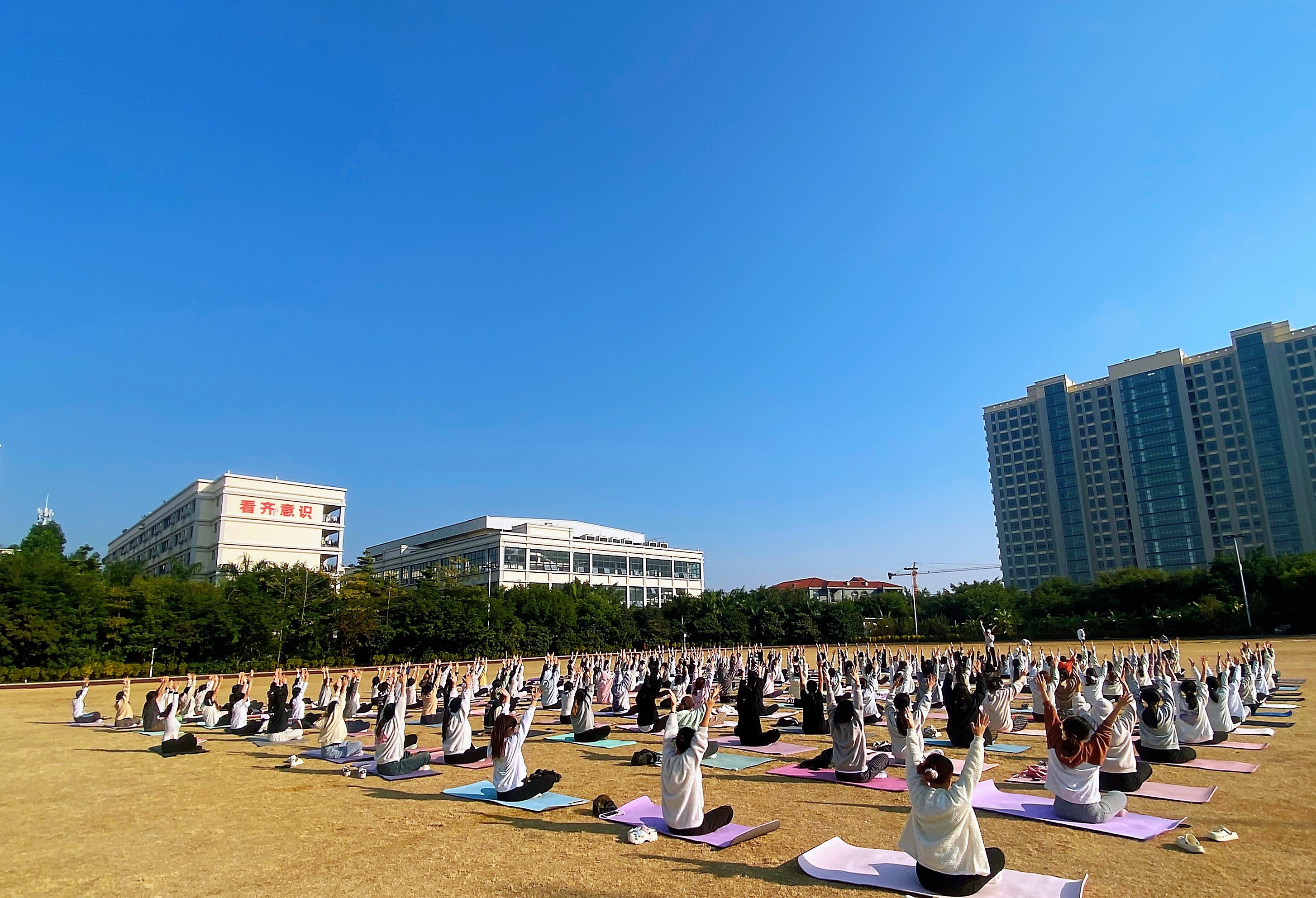 活动当日,参与师生齐聚西校区操场,共同开启瑜伽之旅。在瑜伽老师的带领下,大家伸展肢体、调整呼吸,尽情感受瑜伽的独特魅力。从舒缓的热身动作到高难度的体式挑战,大家全情投入,在呼吸与伸展之间感受身体的律动,释放学习与生活的压力,在自然的怀抱中追寻内心宁静。