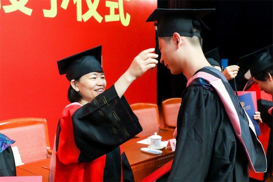 典礼上,学校学位评定委员会委员为毕业生代表颁发毕业证书和学位证书并一一拨穗正冠,合影留念。师长声声祝福温情入耳,眼含欣慰扶手相送;学子毕业礼成,意气风发,振翅高飞。