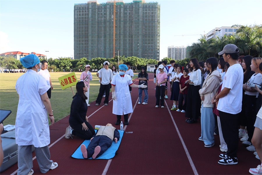 银海区消防救援大队指战员李延松为我校师生及教职工进行消防知识授课,其中包括校园消防常识、常用消防器材使用和逃生技巧讲解,加强校园消防安全知识普及。学校医务室梁丽萍、王娟两位医生进行了心肺复苏讲解和现场演示,并在体验区指导学生实操。