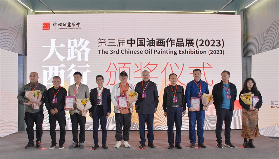 刘宇(左三)在“大路西行——第三届中国油画作品展(2023)”颁奖现场