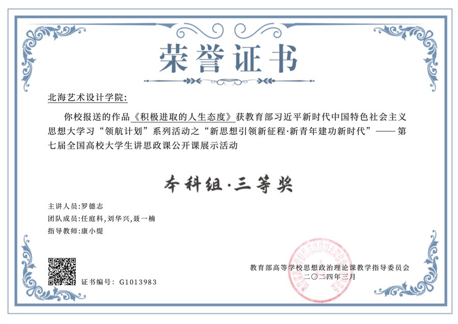 2023年,我校选送作品参加了教育部高校思想政治理论课教学指导委员会、广西壮族自治区教育厅先后举办的习近平新时代中国特色社会主义思想大学习领航计划系列主题教育活动,我校作品在活动中脱颖而出,荣获多项佳绩。其中,大学生讲思政课作品《积极进取的人生态度》荣获“新思想引领新征程·新青年建功新时代”第七届全国高校大学生讲思政课公开课展示活动本科组三等奖;大学生微电影作品《回响》《如愿》《退伍不褪色》荣获“我心中的思政课”2023年全区高校大学生微电影展示活动本科组三等奖。