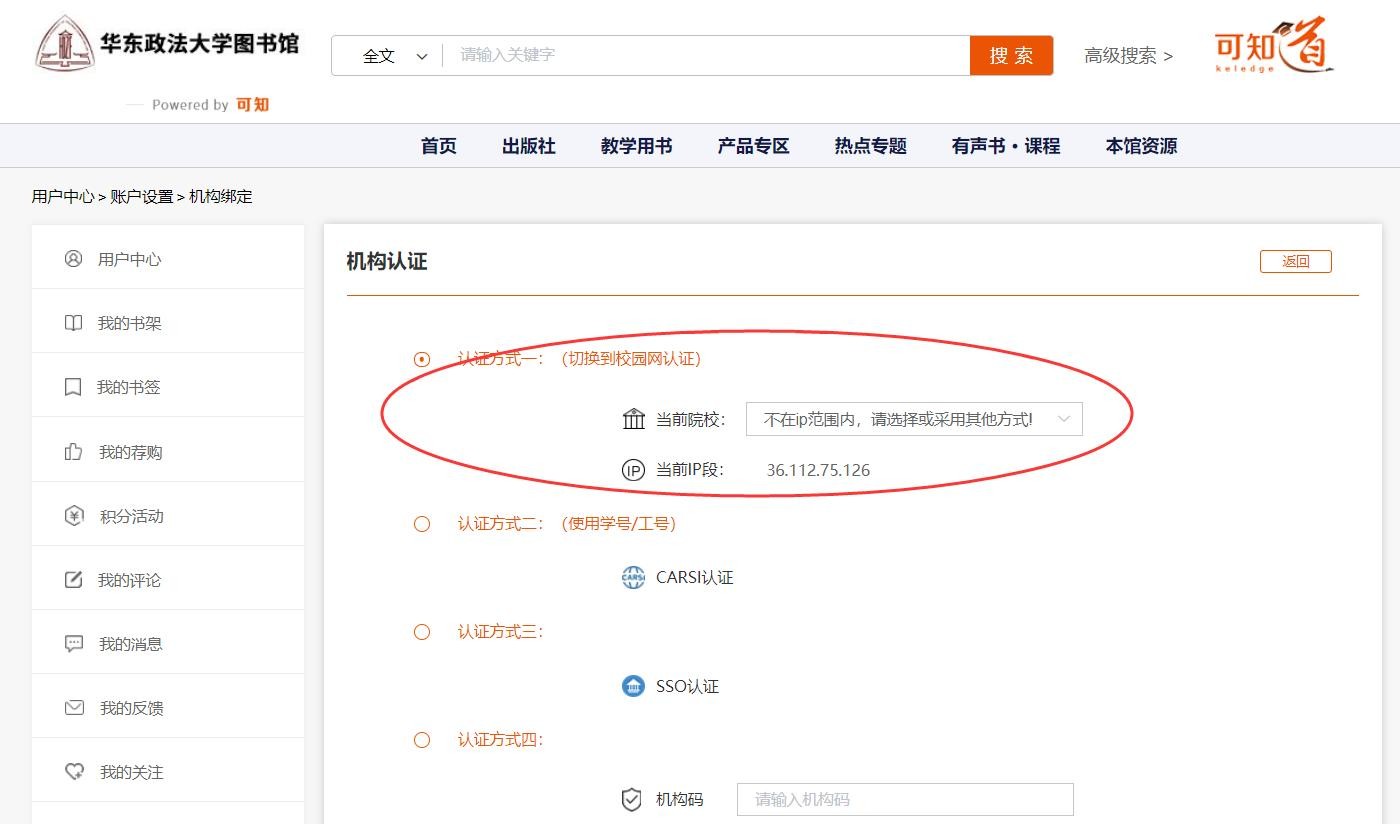 1)校内IP范围内的用户,进入“用户中心”点击“认证”,选择“认证方式一”,即可实现“IP认证”。