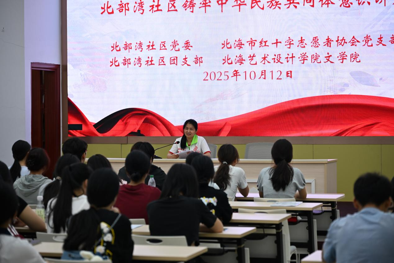 随后,北部湾社区党委书记张燕向志愿者们开展铸牢中华民族共同体意识讲座,张书记结合社区民族工作实际,从历史渊源、政策背景、现实意义三个维度出发,深入阐释了“中华民族一家亲,同心共筑中国梦”的深刻内涵。张书记强调,新时代青年应自觉维护民族团结大局,以实际行动促进各民族交往交流交融。她引用“石榴籽紧紧抱在一起”的比喻,形象说明五十六个民族如同一粒粒石榴籽,只有紧密团结,才能共同绘就中华儿女的大美同心圆。
