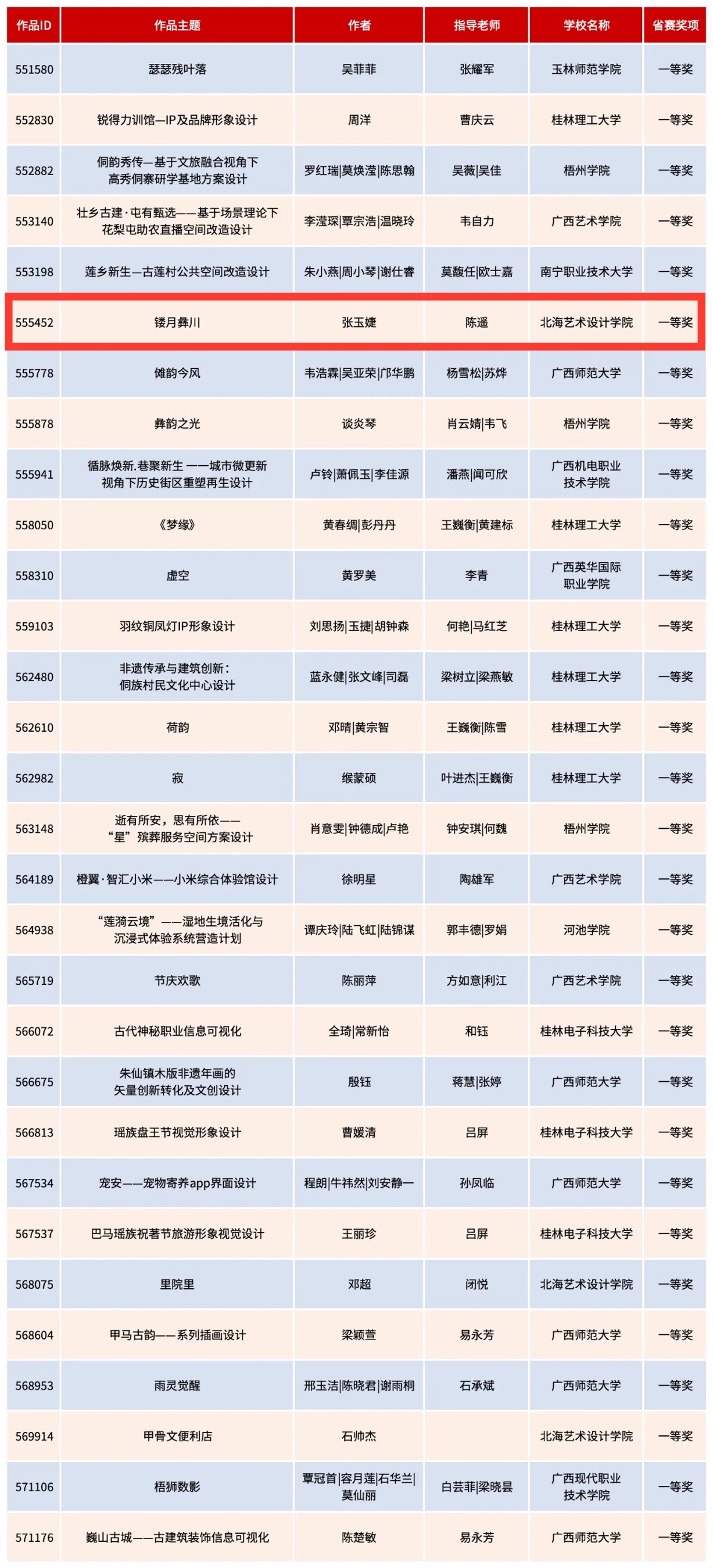 获奖名单按照作品ID大小排列