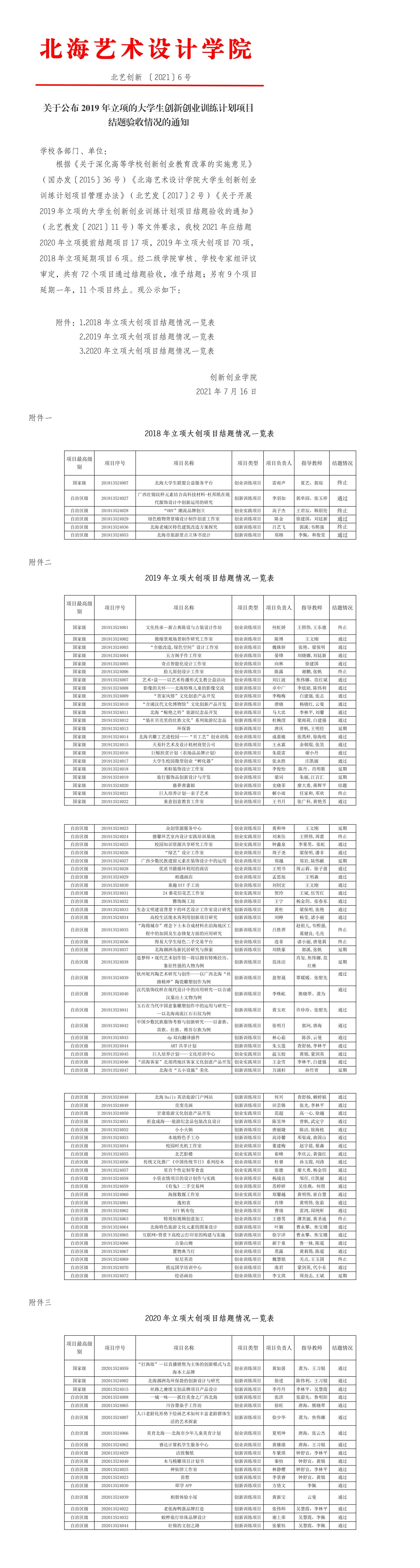 北艺创新〔2021〕6号关于公布2019年立项的大学生创新创业训练计划项目结题验收情况的通知