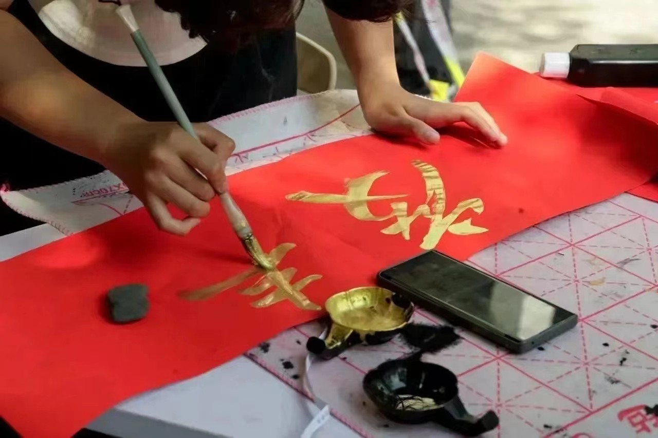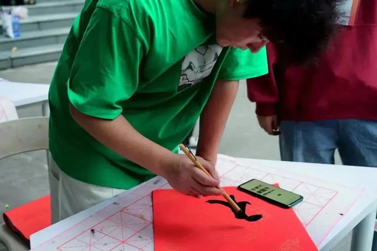 阵阵墨香指尖流,幽幽韵味心脾沁。活动现场,春联纸、毛笔和砚台被整齐地摆放在桌子上,鲜红的纸张渲染着浓浓的节日氛围。一笔一墨、一横一竖、一撇一捺…一幅幅写满新春祝福的春联和“福”字在红色纸间绽开,写的是汉字,报的是节讯,暖的是人心。