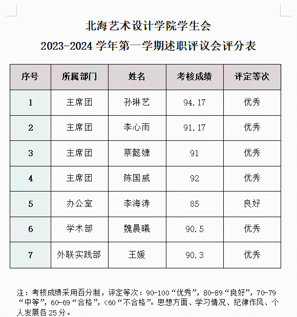 本次参评共有7名学生干部,全部按规定完成考核,并取得了优良的成绩。经各方面的评议,北海艺术设计学院学生会2023—2024学年第一学期述职评议结果如下: