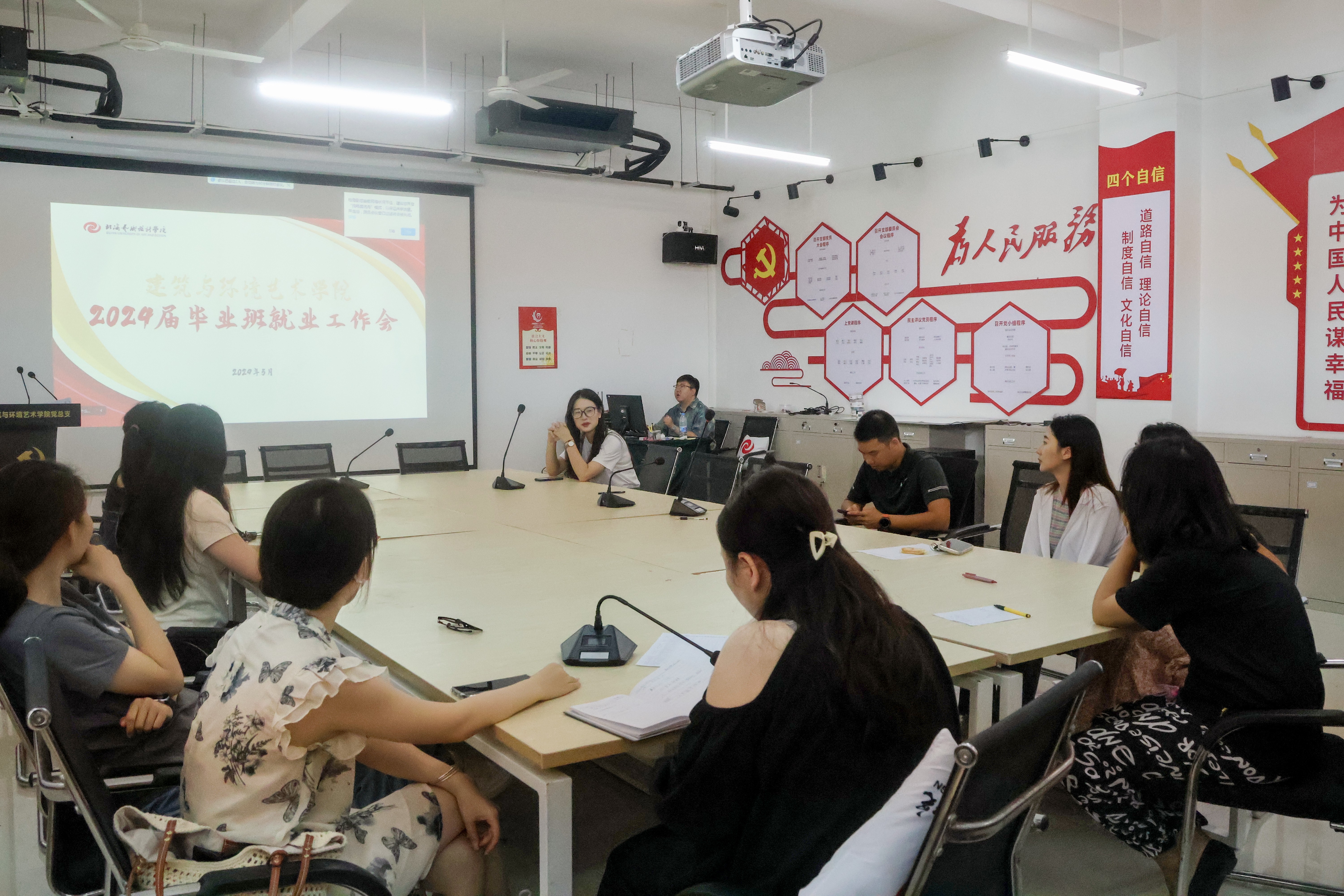 为进一步扎实做好2024届毕业生就业创业工作,全力促进我院毕业生高质量充分就业,建筑与环境艺术学院于2024年5月28日上午召开2024届毕业生就业专题会议。学院分管就业创业工作副书记岳莹、学工办主任曲玥及大三班级辅导员参加此次会议。