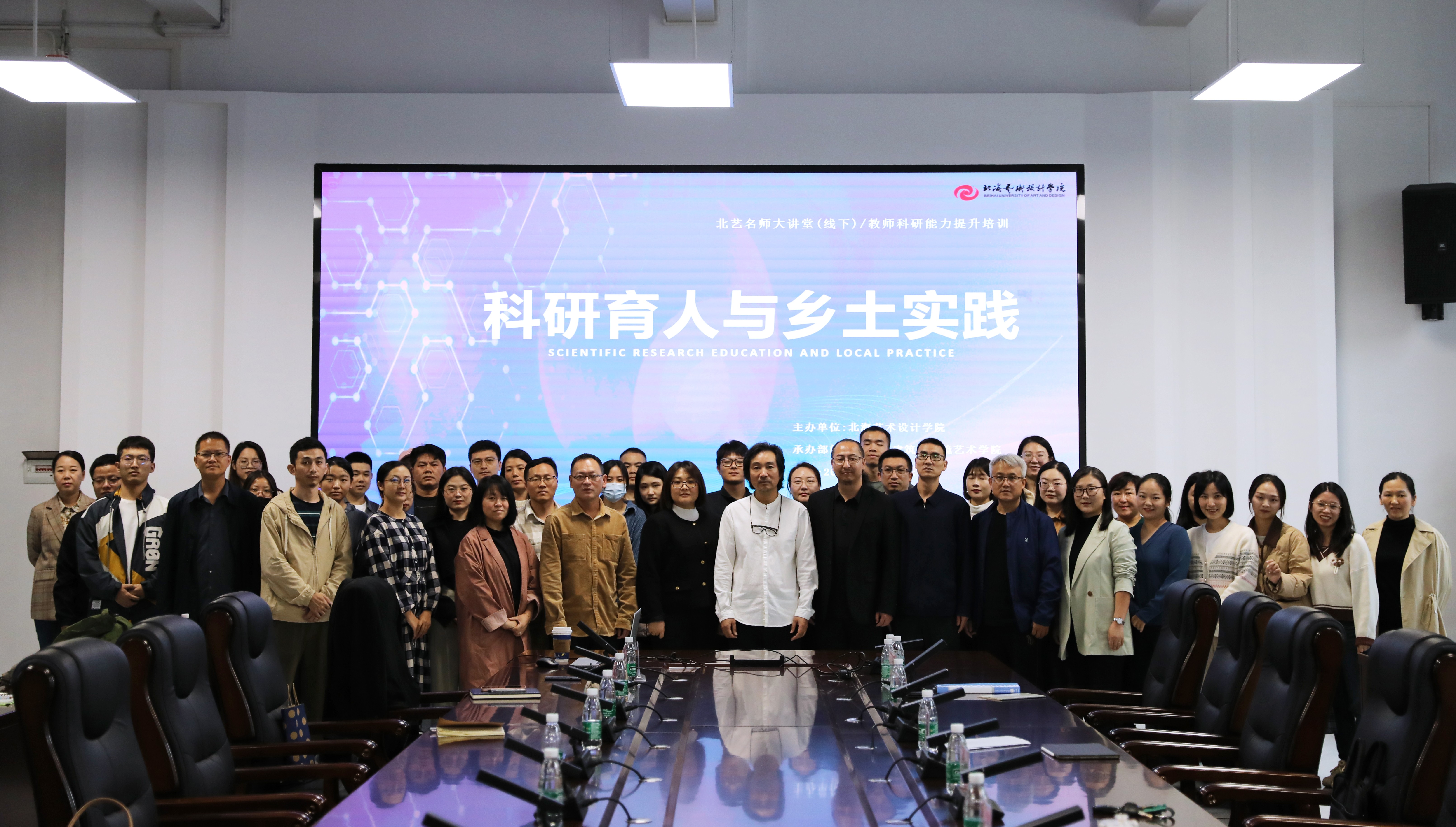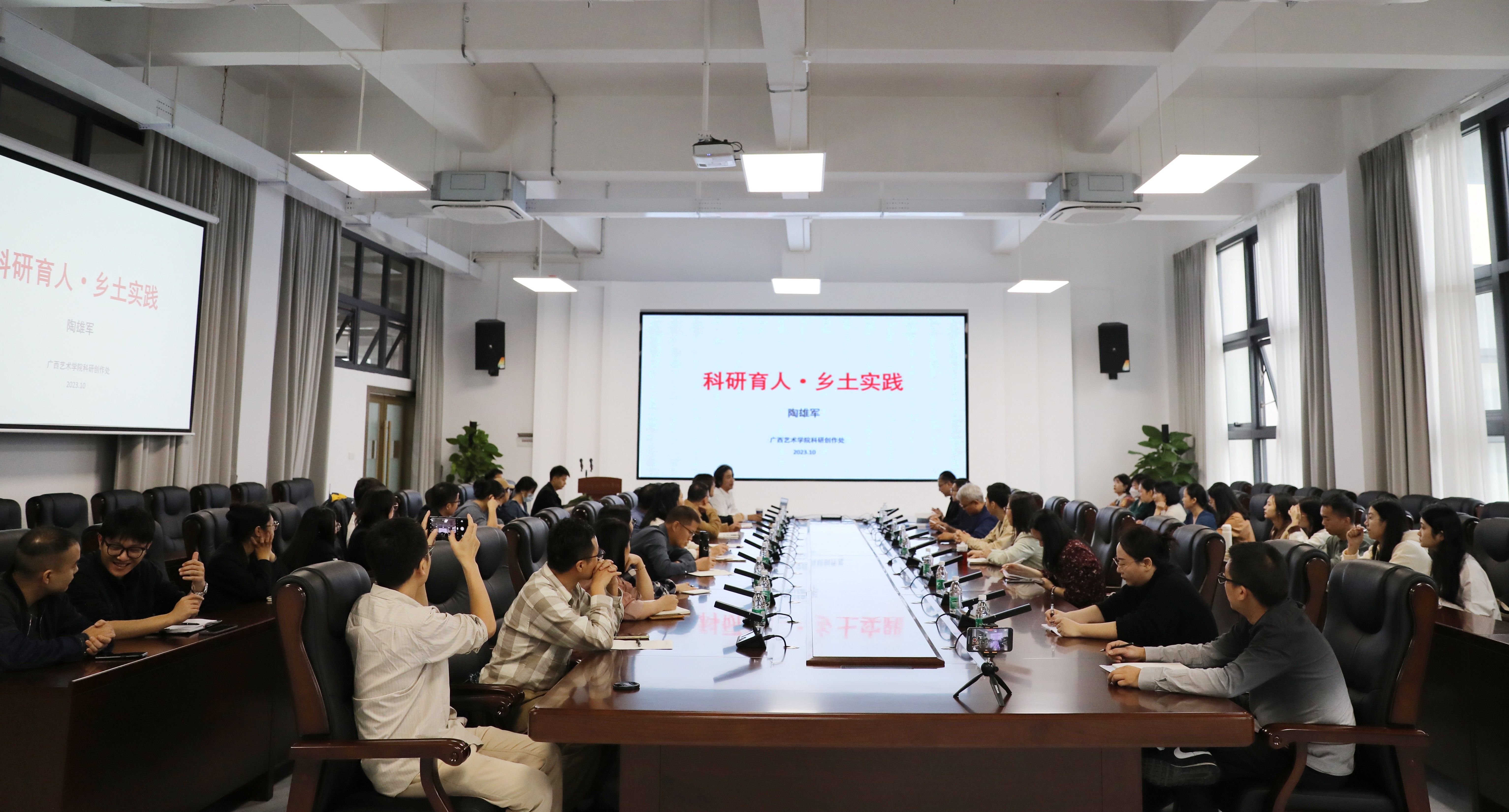 北海艺术设计学院建筑与环境艺术学院于2023年10月21日上午成功举办了一场以“科研育人,乡土实践”为主题的精彩讲座,主题讲座对焦当前高校人才教育发展建设热门话题和高校教师科研创作经验等展开。此次讲座由广西艺术学院科研创作处处长、环境设计学术带头人陶雄军教授主讲,北海艺术设计学院科研处处长刘晓娜进行主持,参会人员包括北海艺术设计学院建筑与环境艺术学院副院长张春东、蔡世伟、王文刚以及各部门负责人和一线教师。