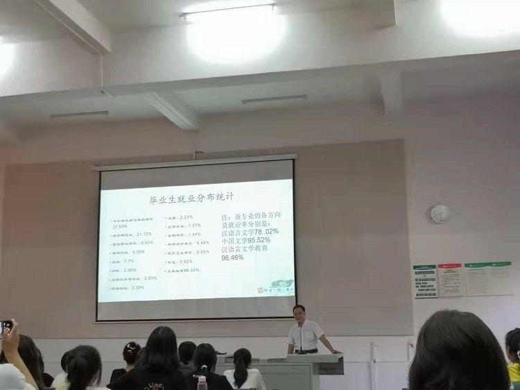 接下来黄教授着重介绍了我院汉语言文学专业的师资队伍、专业特色、培养目标、核心课程、就业岗位等方面的具体情况。黄教授指出,我院汉语言文学专业不仅从校外引进了高层次人才,而且近几年培养了一批年轻的优秀教师,这为我院汉语言文学专业的发展和学生们的求学提供了强有力的后盾,希望同学们可以在老师的教导下认真学习,提高自己的专业素养。另外,黄教授教导学生们要做好大学学习规划,尽力考取相应的证书,为就业打好基础。