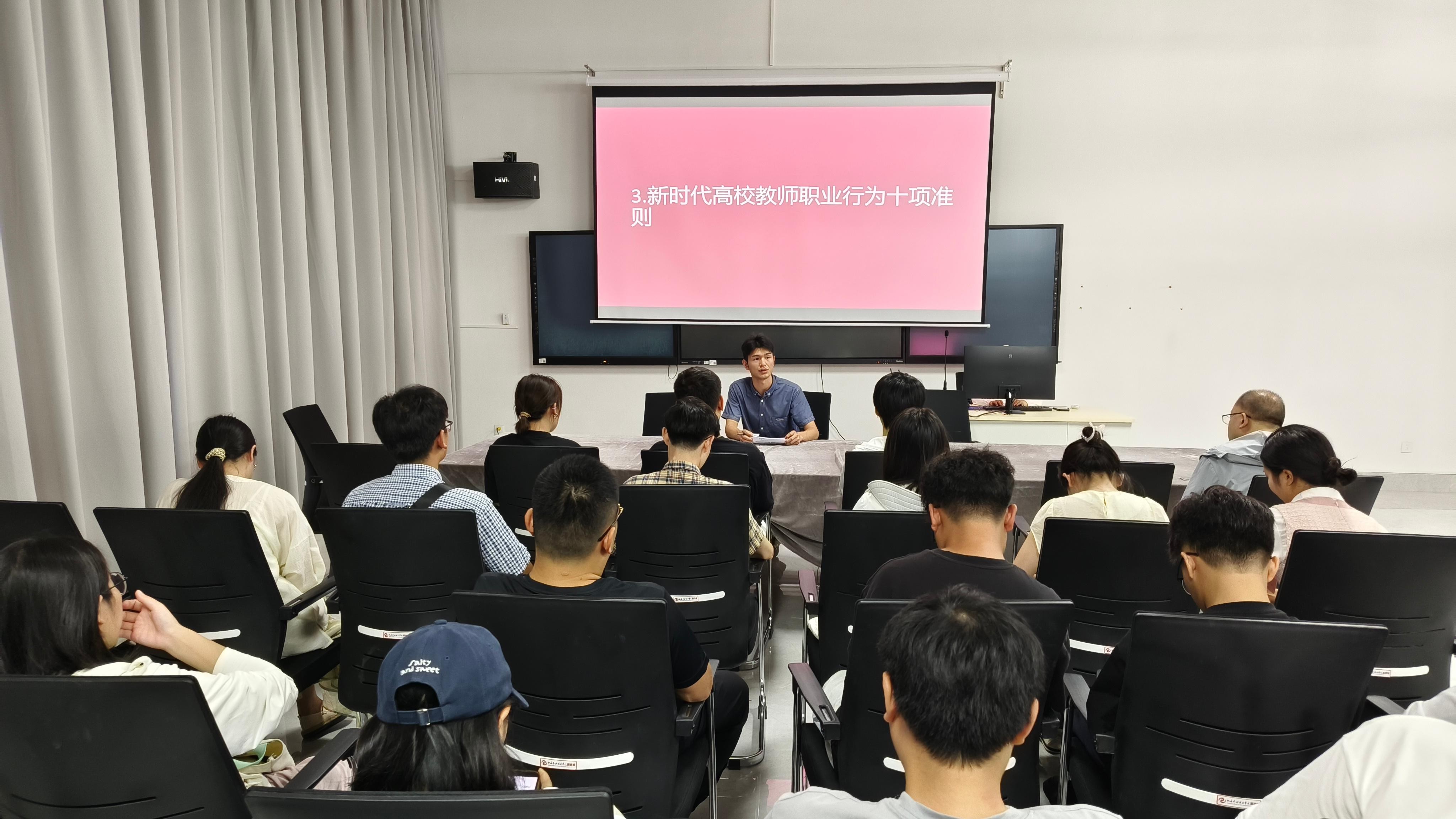 本次师德师风学习会以当前社会环境下教师职业道德面临的挑战和机遇深入,以我院在师德师风方面的实际情况具体展开,通过对各级文件的学习,了解师德师风建设的基础关键性作用。(石建玲 高刚刚 摄)