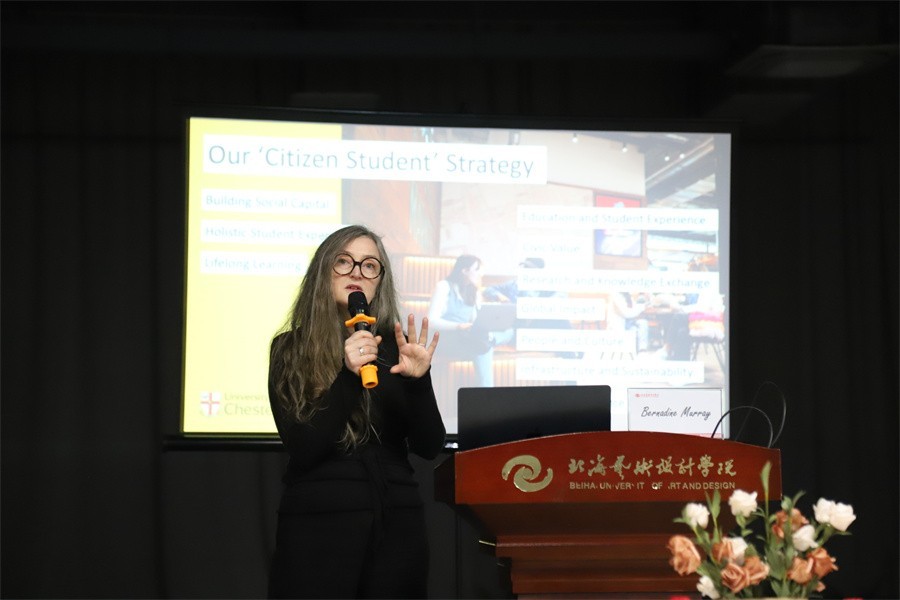 为进一步推动国际学术交流,提升艺术学科创新实践能力,3月10-12日,英国切斯特大学创意产业学院院长伯纳丁·穆雷教授莅临我校交流访问,并开展了为期三天的系列讲座活动。活动期间,学校举行了聘任仪式聘请伯纳丁·穆雷院长作为北海艺术设计学院特聘教授。