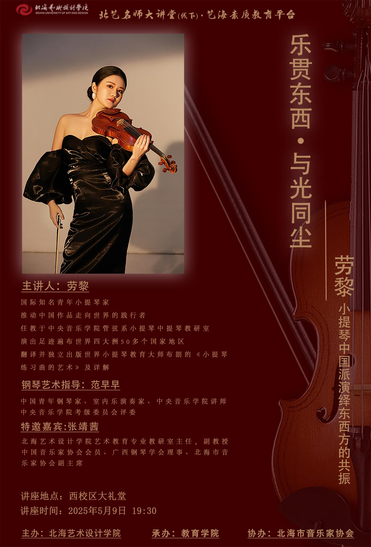 2025年5月9日晚,北海艺术设计学院为深化美育教育实践、提升学生的艺术修养,特邀请到国际乐坛备受瞩目的中国小提琴演奏家、中央音乐学院管弦系劳黎老师,以“乐贯东西・与光同尘”为主题,用灵动的琴弦编织出跨越国界的艺术对话。北海艺术设计学院校长卢新华、副校长包建明、总督学王斌、纪委书记王照伟、教育学院院长熊秀峰、副院长蒙剑英等领导出席了本次活动。同时,本次活动受到了北海市文艺界与教育界的广泛关注,北海市音乐家协会主席林海等众多社会各界的音乐爱好人士莅临活动现场。