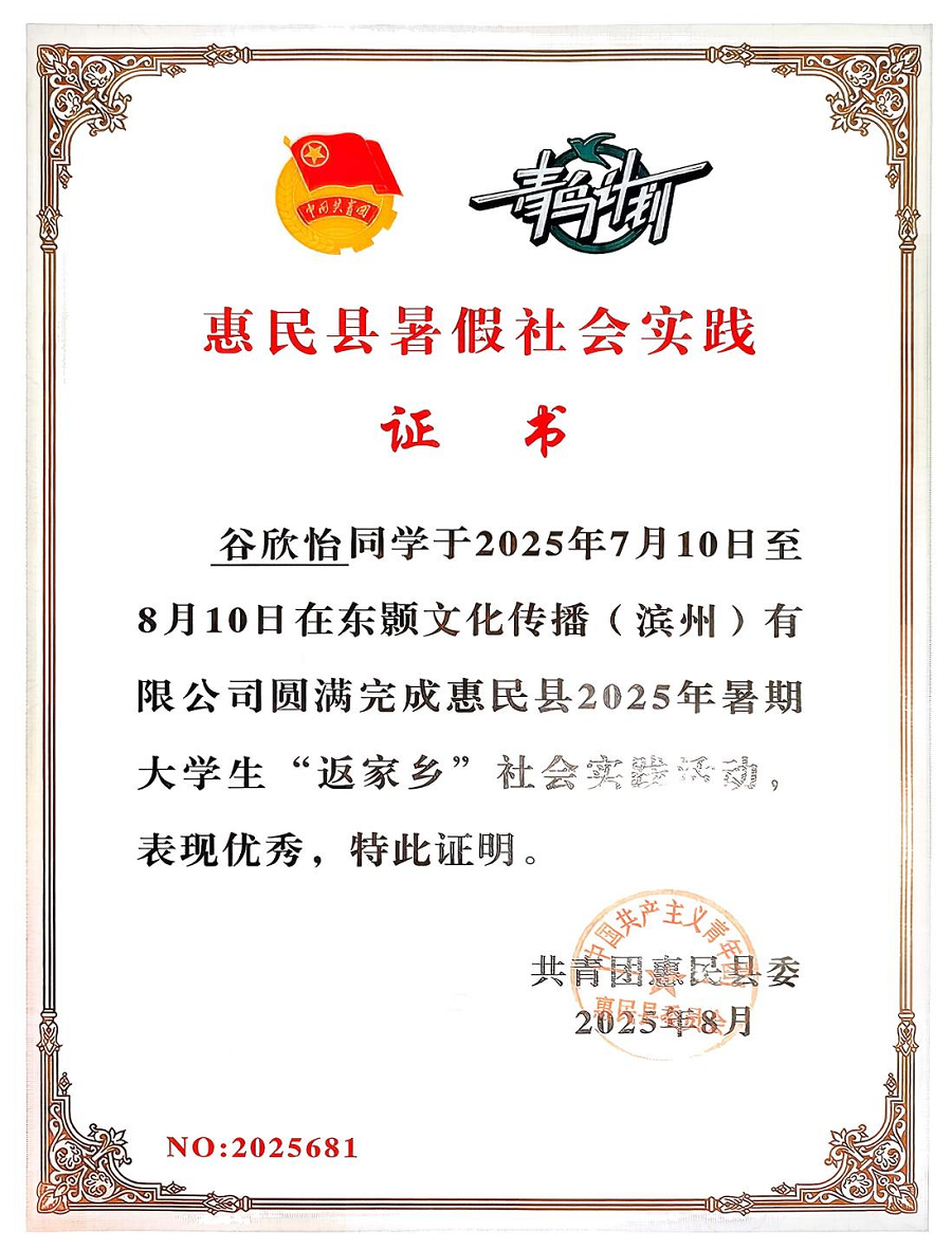 舞表2402班谷欣怡同学在“返家乡”实践活动当中参与积极参与惠民县“滨滨课堂”的组织工作,负责课程安排与学员管理,结合专业知识为孩子们设计“文化创意手工课”,带领青少年用画笔描绘家乡美景。凭借在实践中的突出表现,获得了共青团惠民县委颁发的“优秀实践证书”。