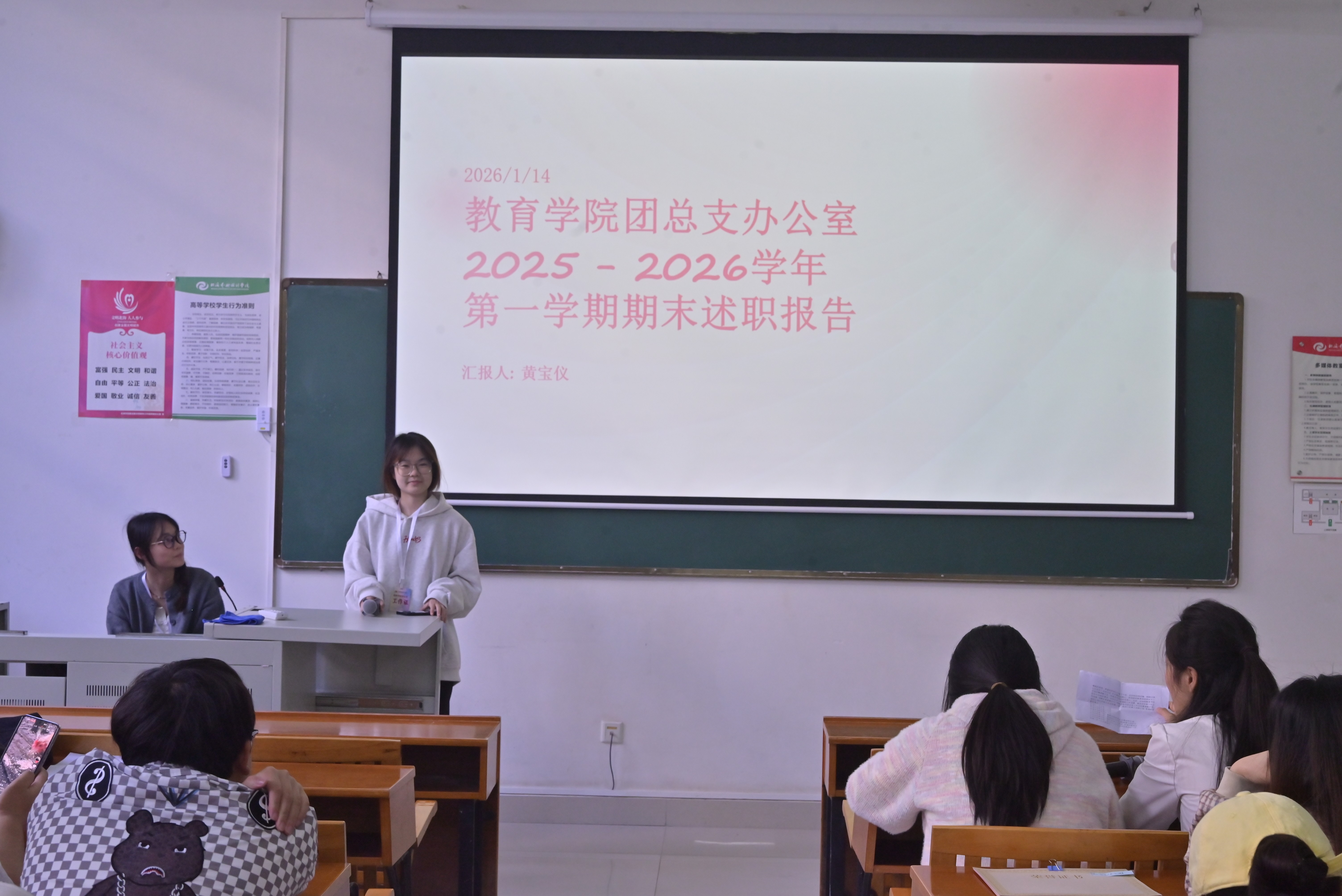 为全面总结本学期团总支各部门工作情况,表彰表现突出的优秀个人,激励全体学生干部在新学期再创佳绩2026114日,教育学院团总支工作总结暨表彰大会在公德楼102教室顺利举行。团总支书记陈美霖与全体学生干部参会。会议由文体部礼仪办主任刘燕菲主持