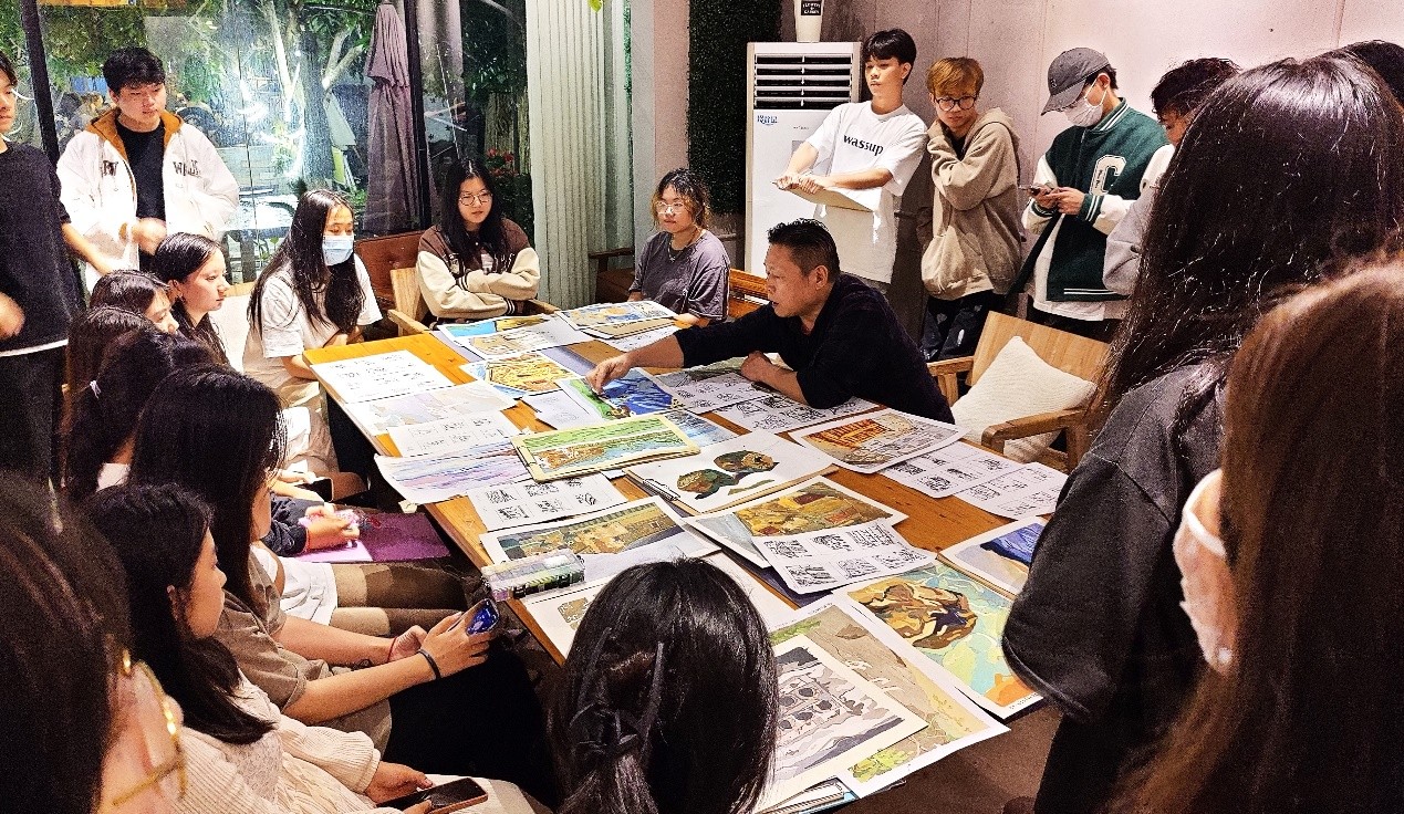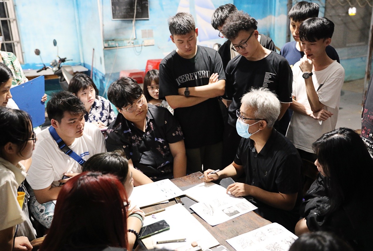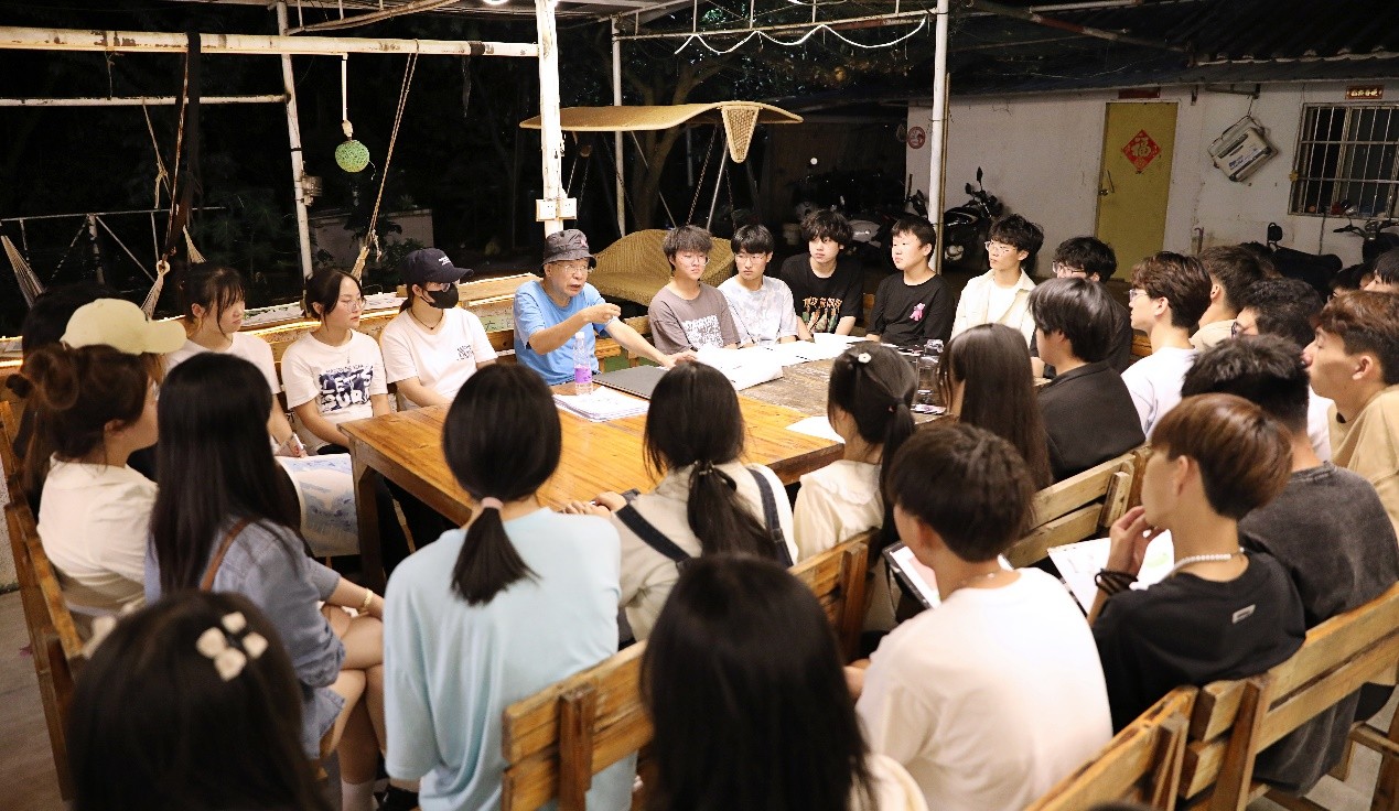 白天,在老师们的带领下,同学们有序深入景区、村庄,通过观察走访体验感悟、实地踏勘拍摄记录、艺术采风绘画写生,结合课程所学知识,感受、观察、分析涠洲岛自然风貌与人文聚落,领悟地方性色彩、空间等元素的构成魅力,并以自身理解运用美术基础与设计表现技法绘出“设计色彩”图幅。过程中,老师们悉心指导,帮助同学们了解掌握取景、构图、取舍、表现。晚上,专任教师辅助指导,教授以班级为单位开展评图教学课堂。微弱灯光抵不住同学们对专业知识学习的偌大热情,每位同学积极听取指导教授的点评意见,努力提高自身的艺术涵养与表现技法。
