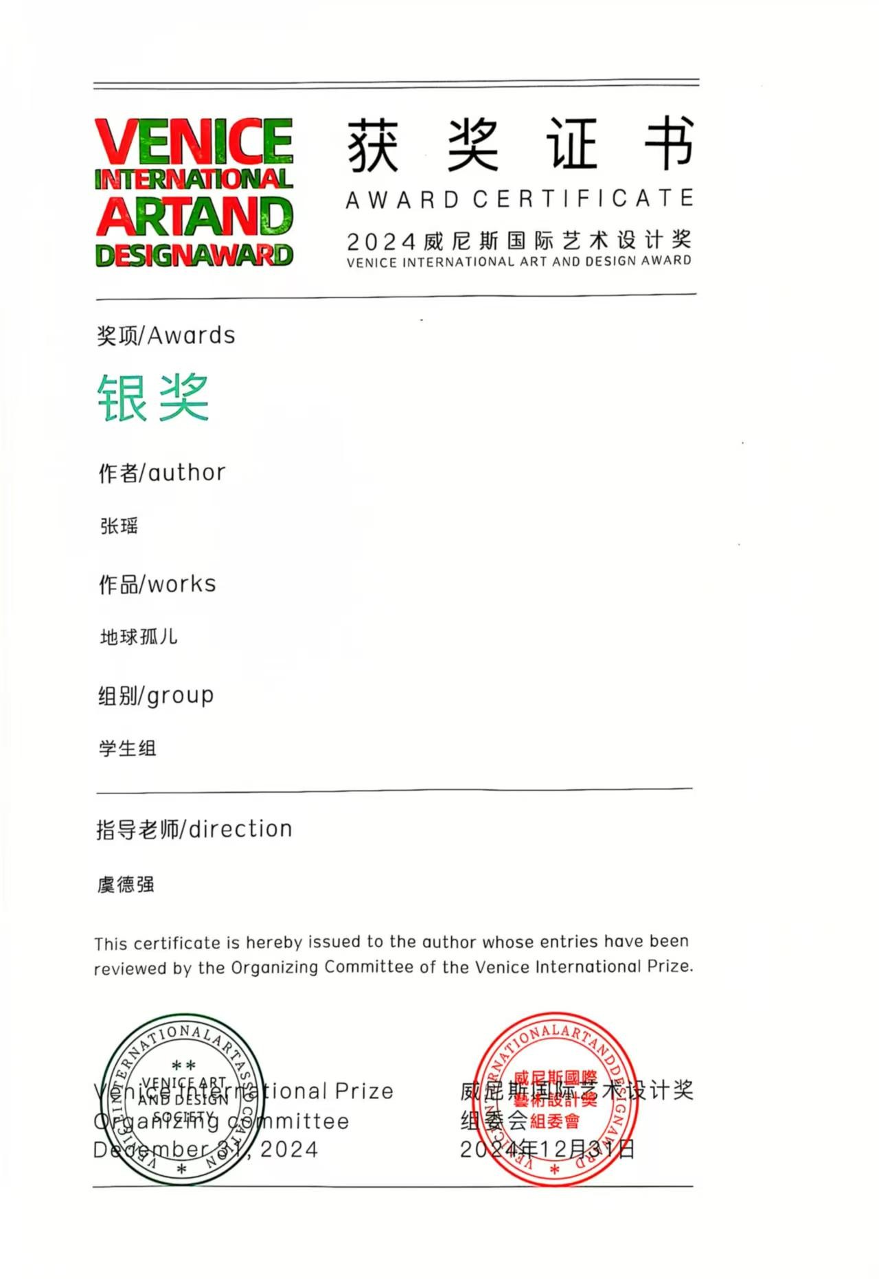 12月31日,备受瞩目的2024威尼斯国际艺术设计奖圆满落幕。本次大赛由威尼斯国际艺术设计奖组委会、意大利VIADA设计协会等机构联合举办,吸引了国内外设计界的广泛关注。动画与传媒学院学生张瑶的动画作品《地球孤儿》在本次大赛中脱颖而出,荣获银奖。