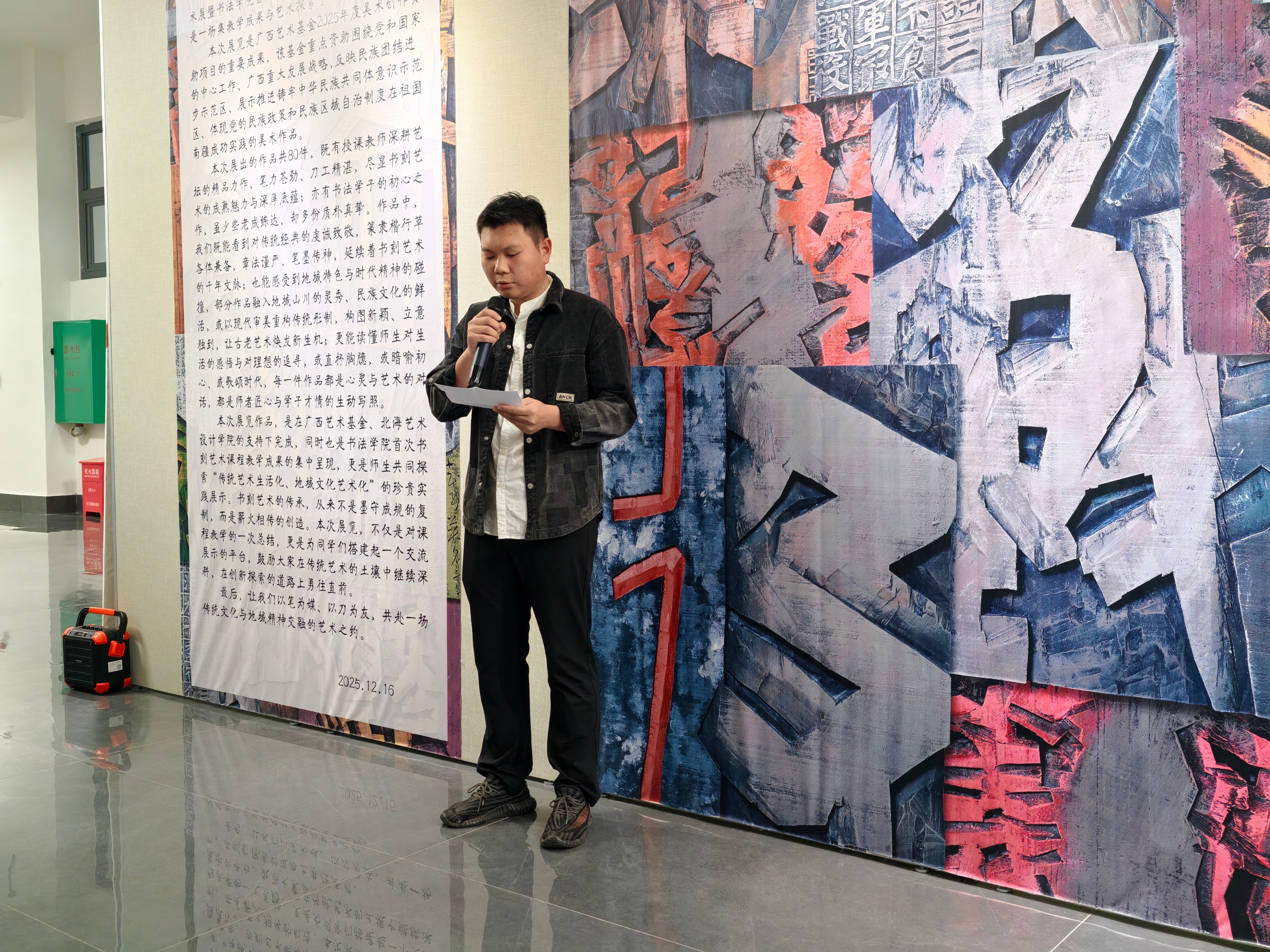 12月19日下午,“桂风书刻——江威龙书刻艺术展暨书法学院首届师生书刻作品展”在北海艺术设计学院唯物楼四楼展区正式拉开帷幕。本次展览作为广西艺术基金2025年度美术创作资助项目的重要成果,由北海艺术设计学院书法学院主办、书法学教研室承办,展期持续至12月31日。