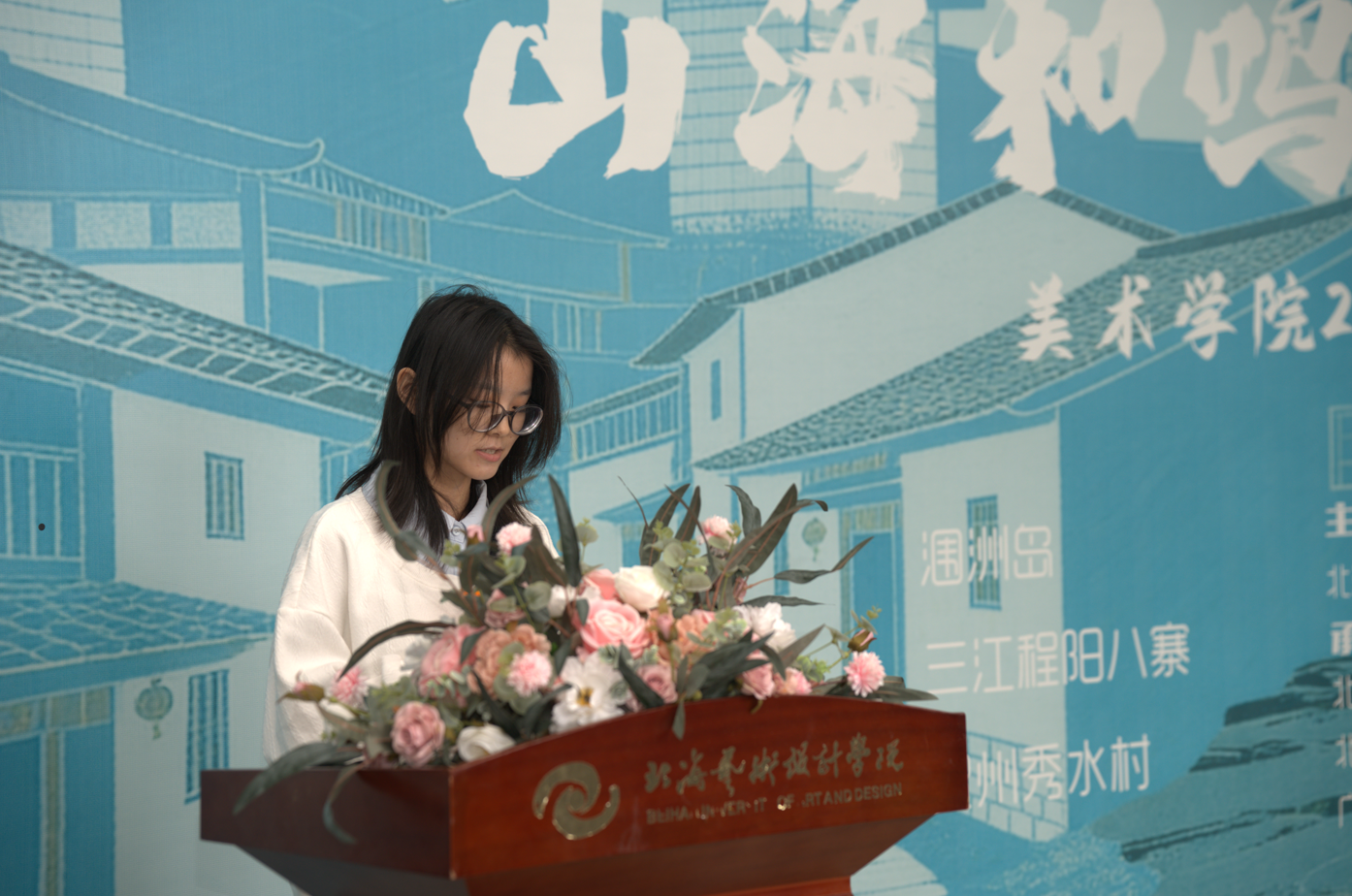 接着,学生代表刘佳敏同学发言。其首先对出席开幕式的师生表示敬意,并分享了在秀水村的写生经历,让她感受到了大自然的壮丽与人文景观的深厚底蕴,也通过与大自然的对话深刻领悟艺术真谛。其提到,每一幅作品都承载着师生们对美的追求与感悟,是艺术之旅的真实记录,写生之旅不仅是对景物的描绘,更是对本土文化和情感的深刻表达与探索。美术学院师生通过写生实践,将艺术融入生活,展现了教育对个人成长的深远影响。
