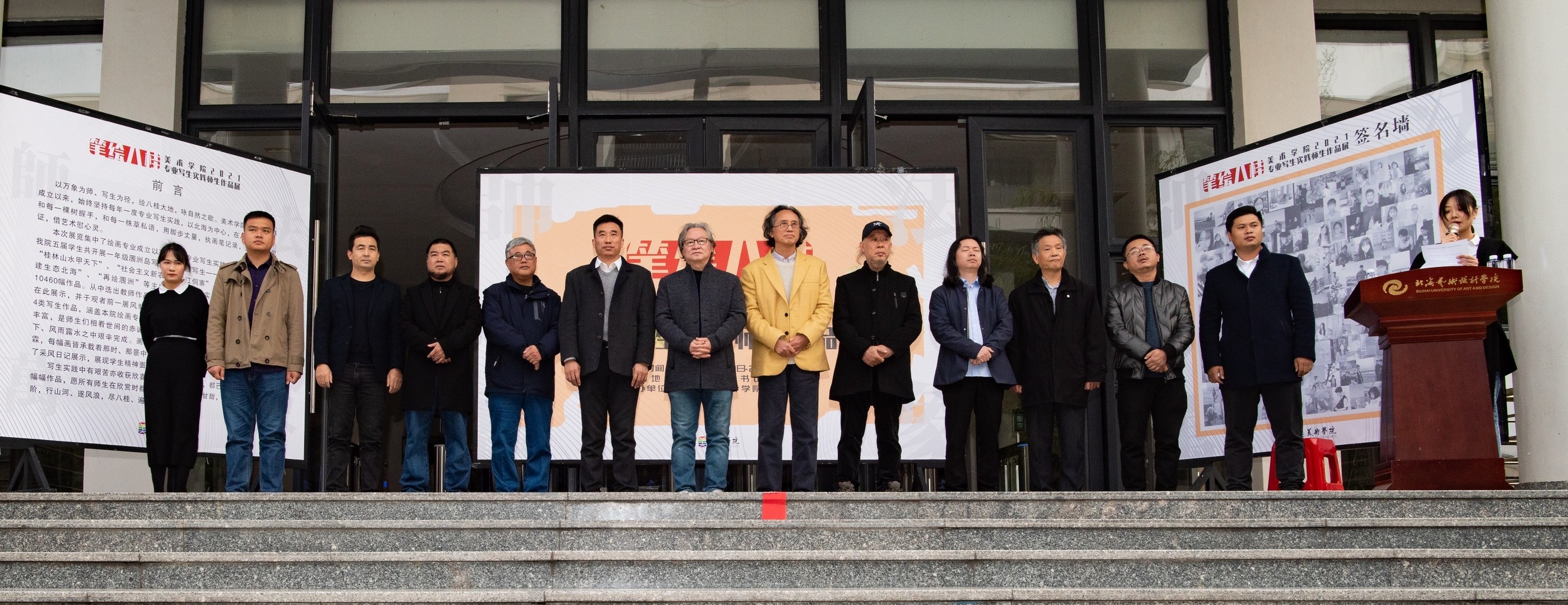 20211231日下午430,美术学院于西校区图书馆一楼展厅举行美术学院“笔绘八桂”——美术学院绘画专业写生实践师生作品展。本次展览出席的嘉宾有北海艺术设计学院校长卢新华,北海艺术设计学院副校长胡胜,北海艺术设计学院副校长陶立阳,北海市美术家协会主席、北海艺术设计学院特聘教授肖畅恒,北海市画院院长、北海艺术设计学院特聘教授蔡群徽,北海艺术设计学院美术学院潘毅群教授、巫维轩教授,北海艺术设计学院动画学院党总支书记孙永辉,北海艺术设计学院美术学院党总支书记韩玮,北海艺术设计学院美术学院副院长龚为,北海艺术设计学院美术学院绘画教研室主任张湘中,北海艺术设计学院美术学院综合办主任、专业写生系列课程负责人肖玺,以及美术学院绘画专业部分师生。美术学院郭珂老师主持本次汇报展,肖玺老师以及优秀学生代表徐进以及卢新华校长先后分别进行了发言。