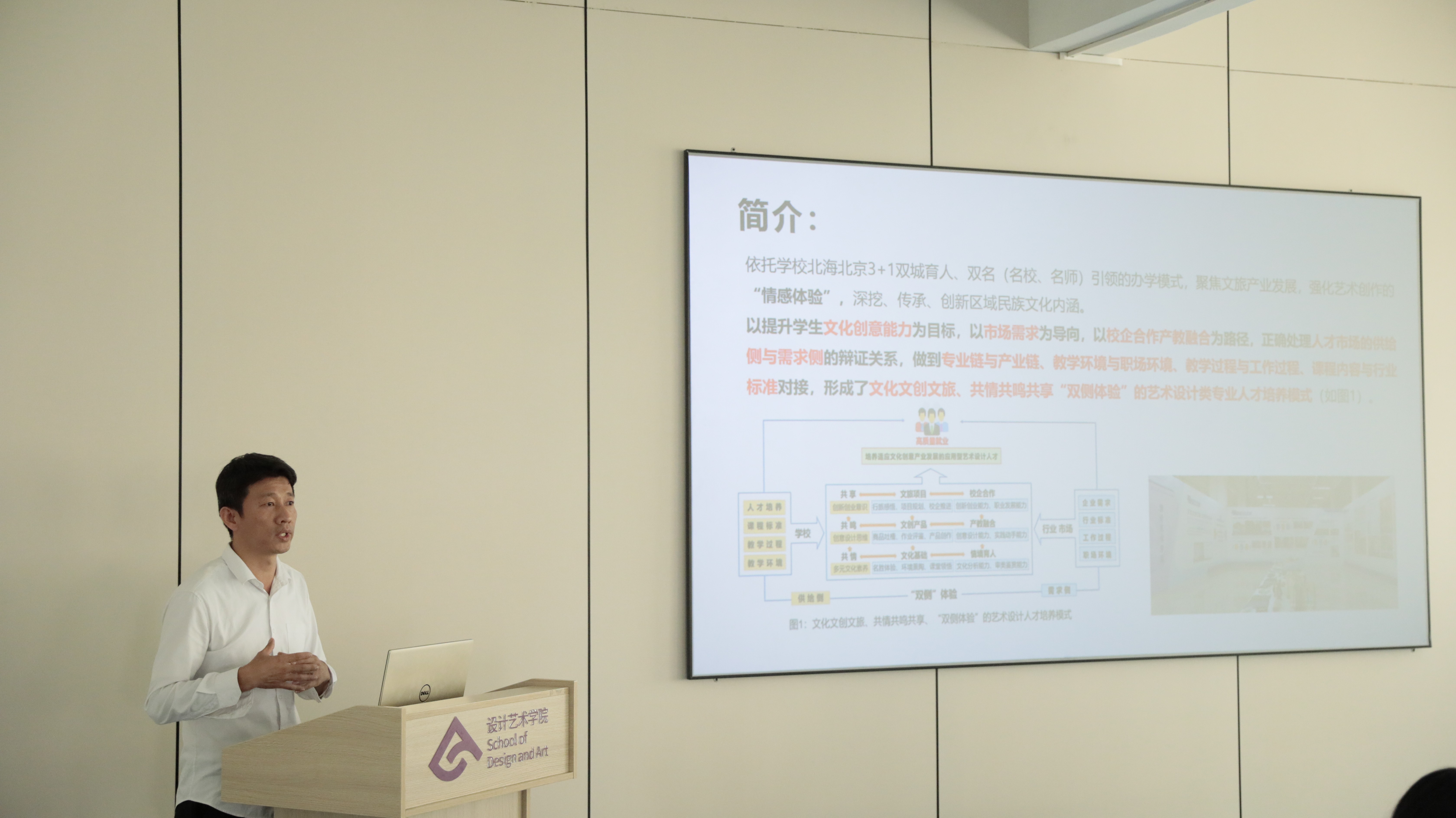 白建强副院长随后围绕学院近年来的教学改革进行了主题为:“文化文创文旅、共情共鸣共享‘双侧体验’艺术设计类人才培养模式实践”的汇报。特别强调了“情感体验”在艺术创作中的重要性,并呼吁更多关注区域民族文化的传承和创新。他还提到,人工智能正在改变设计教育的传统模式,但真正的艺术设计不仅仅是技术,更多的是情感和人文价值。