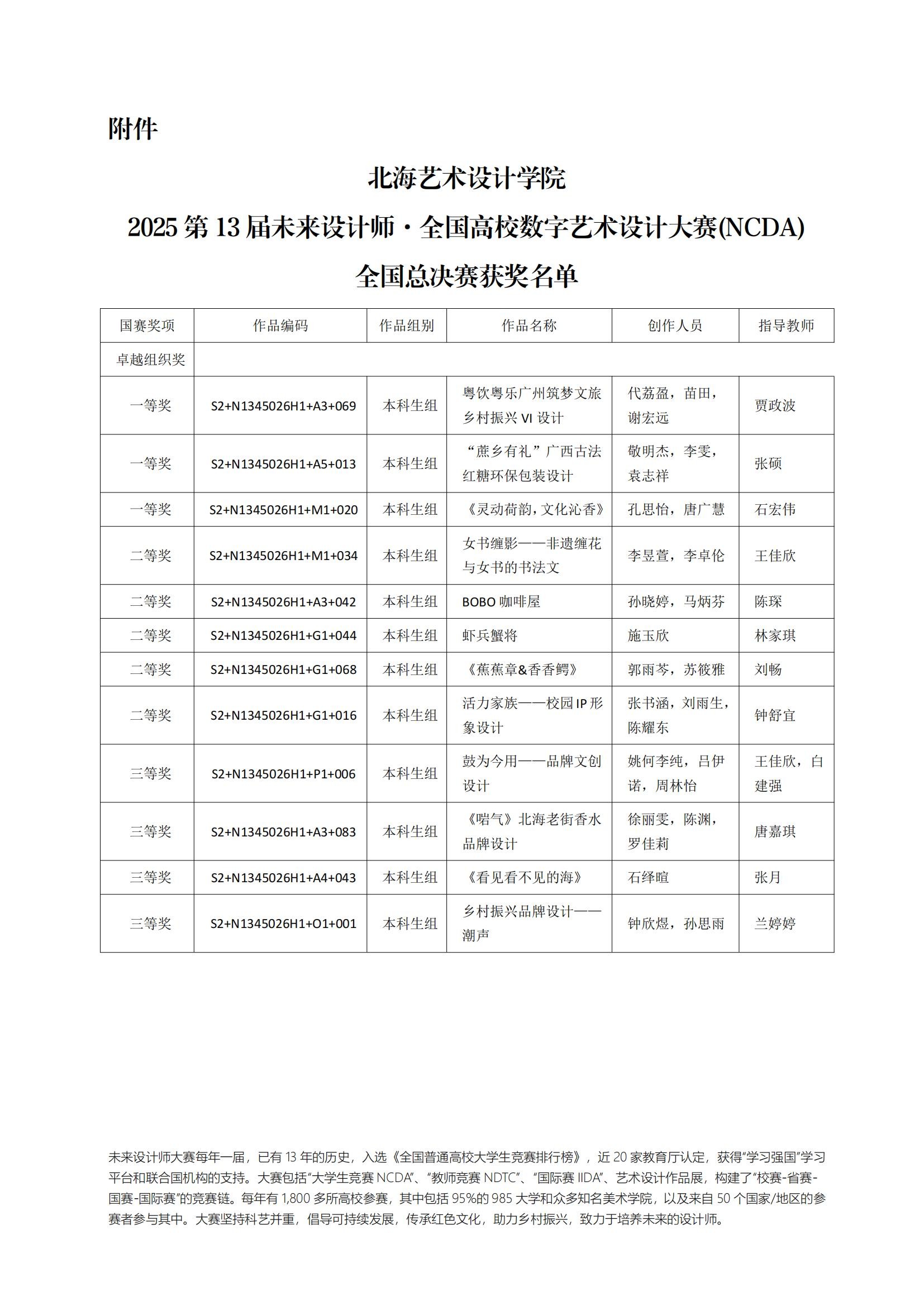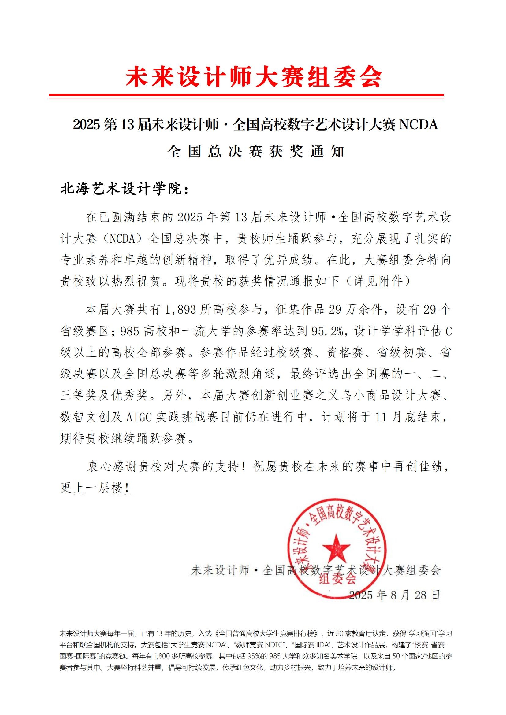 近日,2025第13届未来设计师·全国高校数字艺术设计大赛(NCDA)圆满落幕。我院设计专业学子在此次大赛中表现突出,共获奖项12项,其中全国一等奖3项,全国二等奖5项,全国三等奖4项;共26位教师获得“优秀指导教师”称号,充分展现了我院师生扎实的专业素养和卓越的创新精神