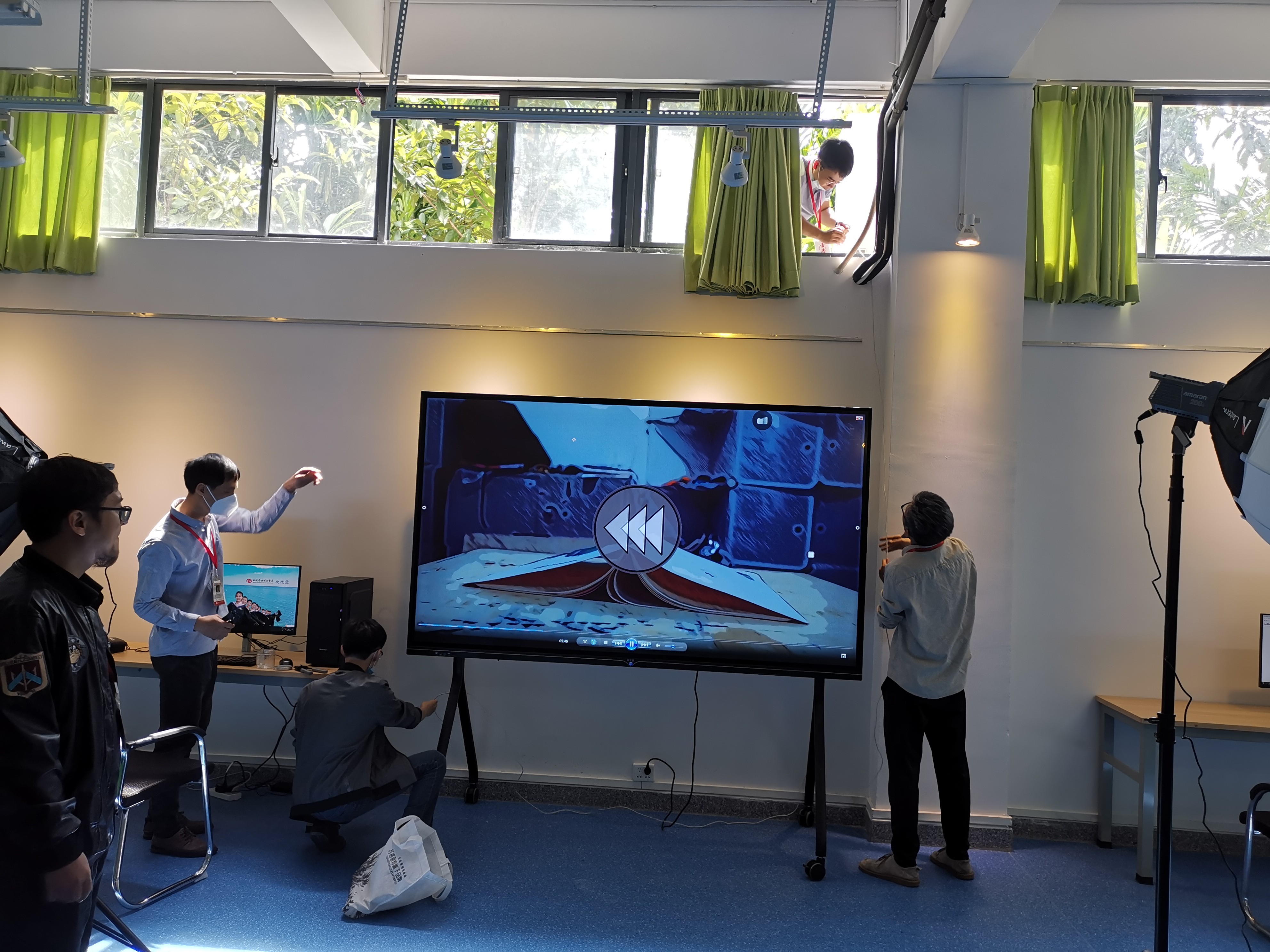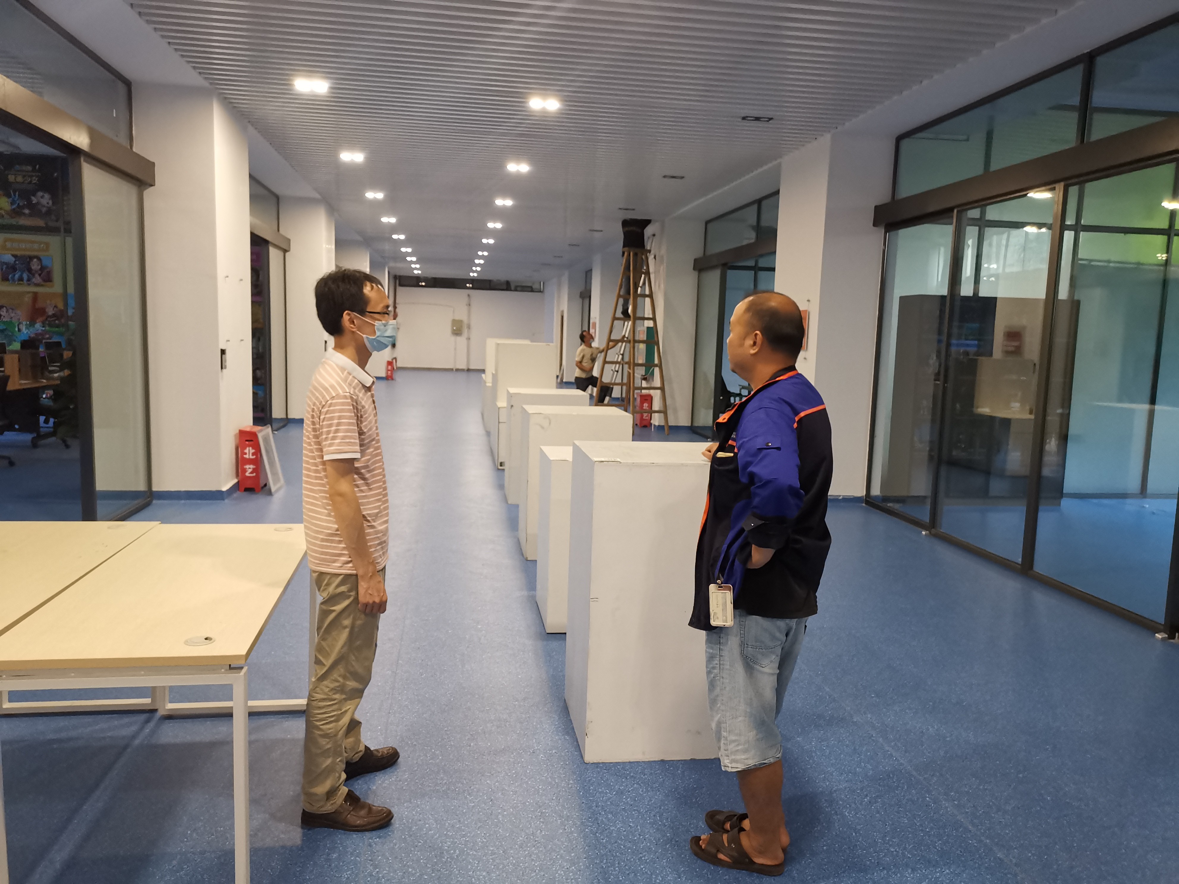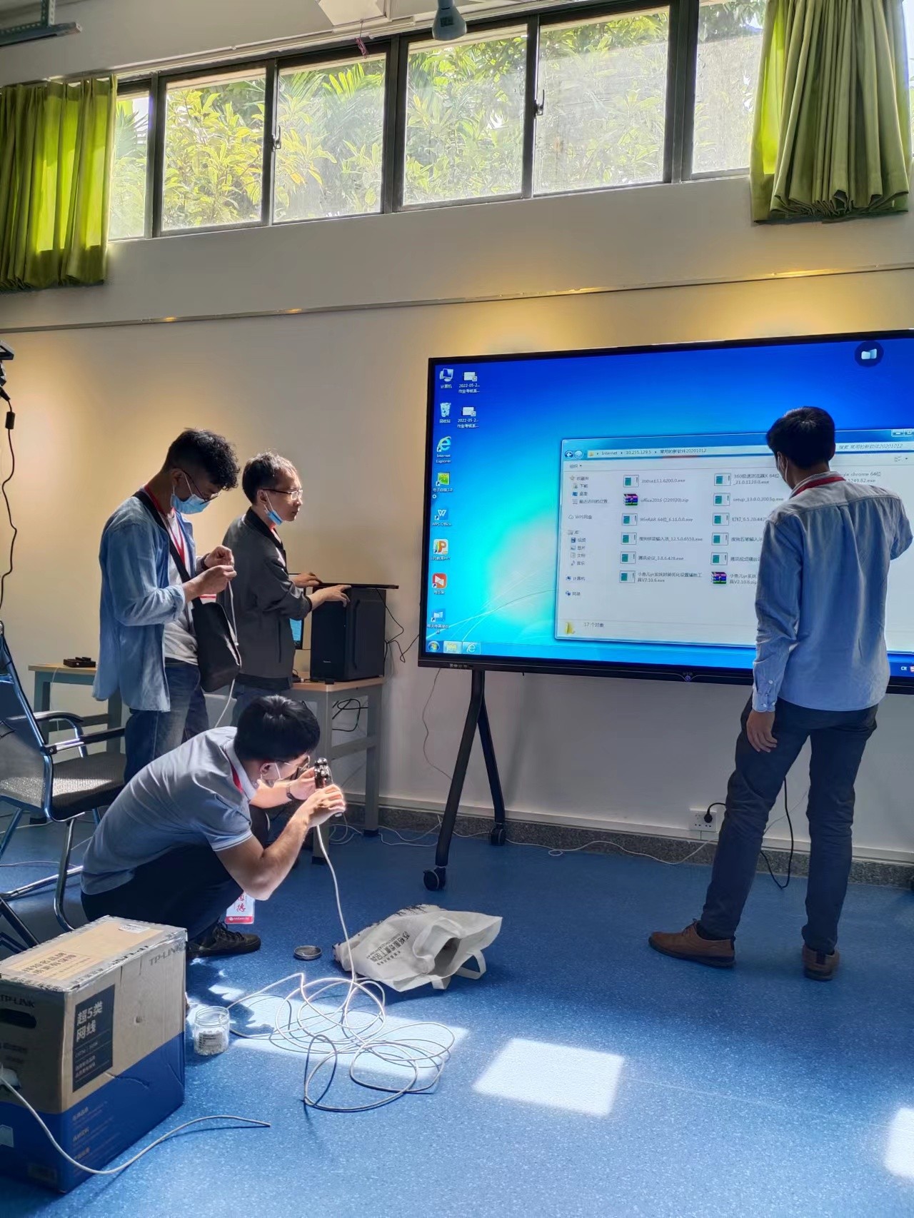 学校图书馆负一楼的15个展厅需要接入网络,设备与信息处联合网络供应商联通公司,现场排查安放网络设备,布线,保障展厅正常投入使用。(劳大耀/摄)