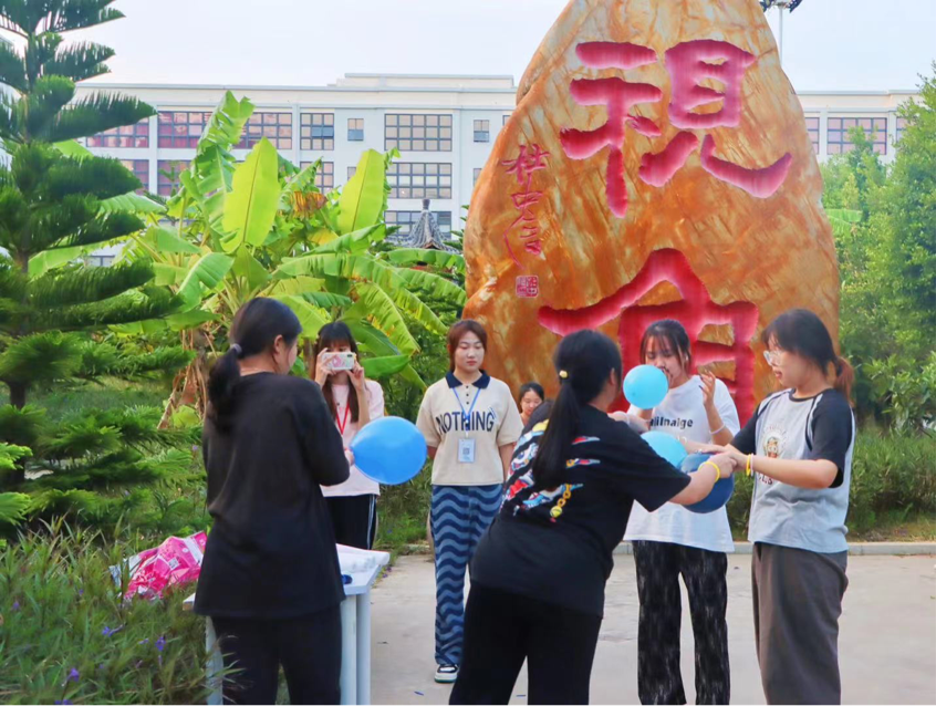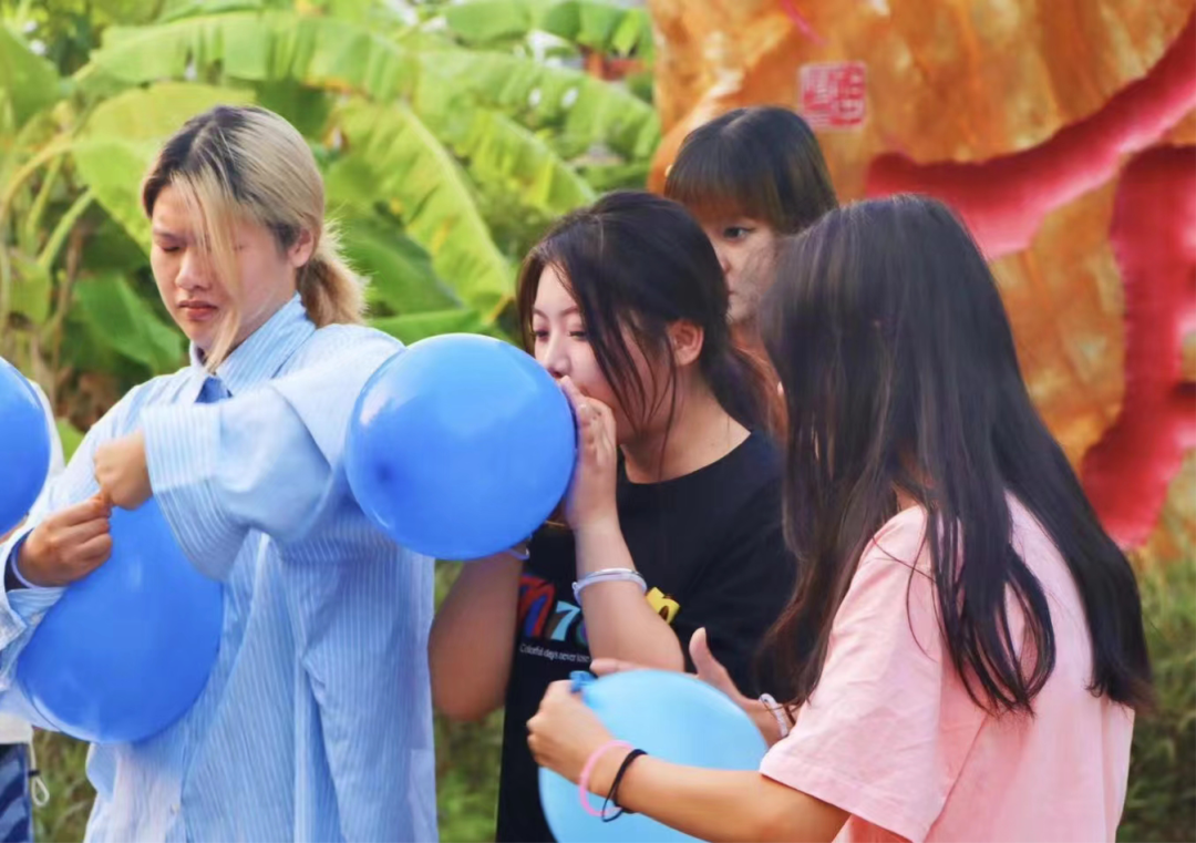 关卡三:快乐爆气球接力赛,同学们自由组合为两个俩人小组,比赛开始后第一组成员合力吹打6个气球,由第二组成员负责依次在地上坐爆,直至两组全部完成,视为过关。在惧怕气球爆炸声的情况下,同学们还是表现了他们闪闪发光的一面。