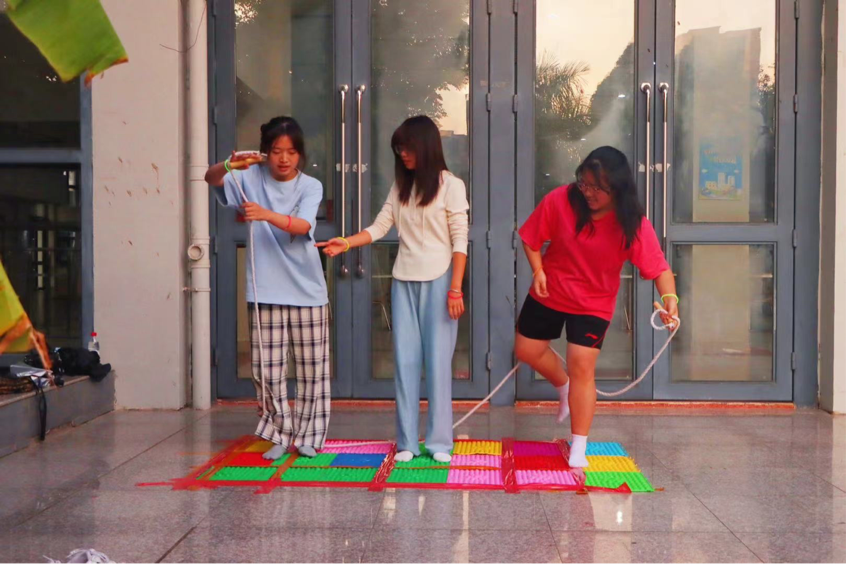 这个游戏十分考验队员之间的默契,只要有一个人步伐不一致,一不小心就会整组摔倒。