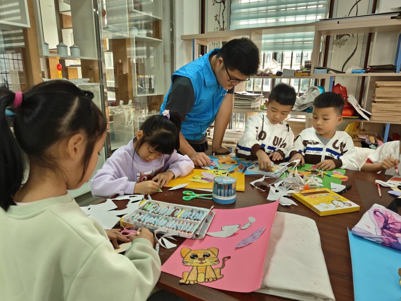 除了绘画支教,志愿者们还进行了手工支教。以手造物,以物寄情。志愿者们指导孩子们先在纸面上画出小老虎,以及小老虎背后的各种小元素。接着他们用剪刀在纸上裁出了形状,粘贴在一个背景板上。充满想象力的小老虎就在孩子们的手工中诞生了!